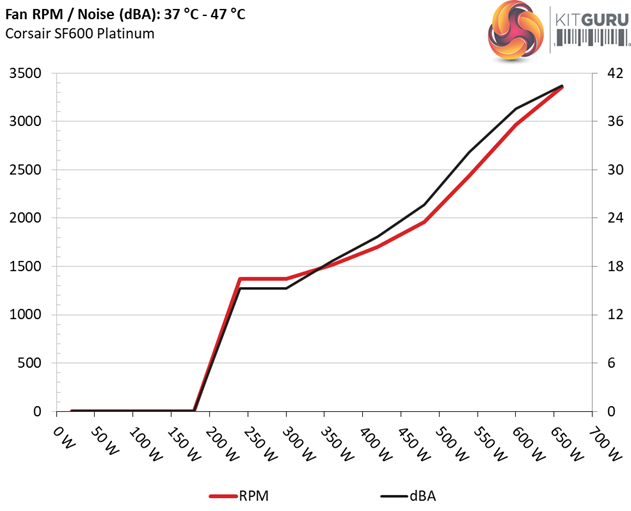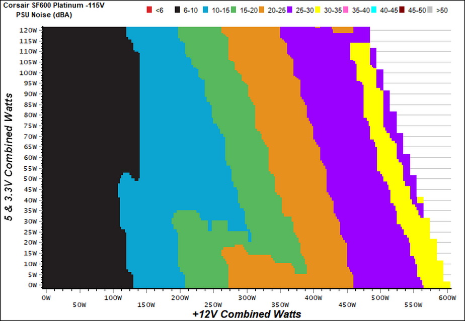 The next chart shows the cooling fan's speed (again, in RPM) and output noise. We measure acoustics from one meter away, inside a hemi-anechoic chamber. Background noise inside the chamber is below 6 dB(A) during testing (it's actually much lower, but our sound meter’s microphone hits its floor), and the results are obtained with the PSU operating at 37°C (98.6°F) to 47°C (116.6°F) ambient temperature.