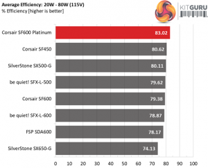 In the following tests, we measure the efficiency of the SF600 Platinum at loads significantly lower than 10 percent of its maximum capacity (the lowest load the 80 PLUS standard measures). The loads we dial are 20, 40, 60, and 80W. This is important for representing when a PC is idle, with power-saving features turned on.