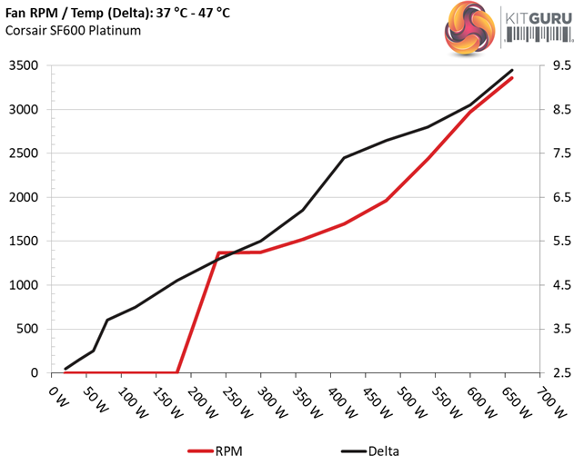 The first chart below illustrates the cooling fan's speed (in RPM), and the delta between input and output temperature. The results were obtained at 37°C (98.6°F) to 47°C (116.6°F) ambient temperature.