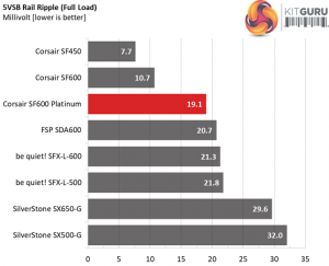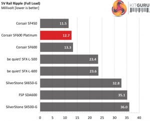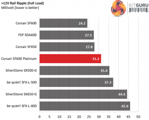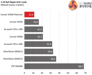 The following table includes the ripple levels we measured on the rails of the SF600 Platinum. The limits, according to the ATX specification, are 120mV (+12V) and 50mV (5V, 3.3V, and 5VSB).