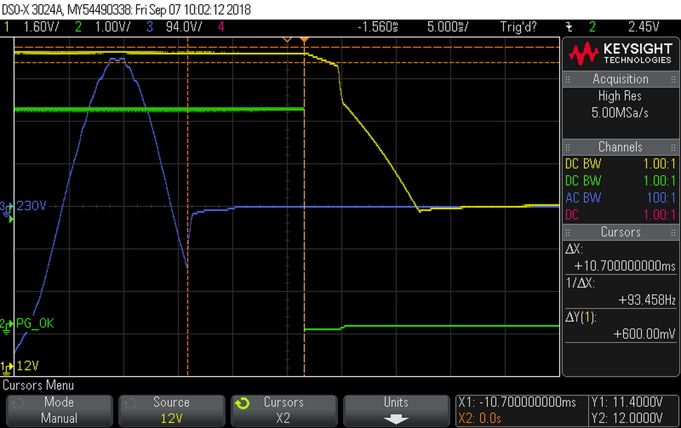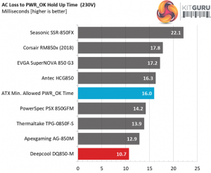 The bulk cap's capacity is not high enough to offer a longer than 17ms hold-up time and this is a great shame. At least the power ok signal is accurate, however it is much lower than 16ms that the ATX spec requires.