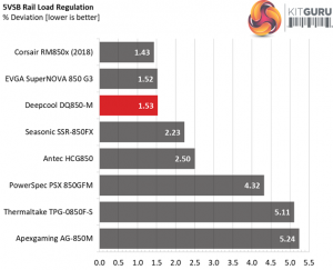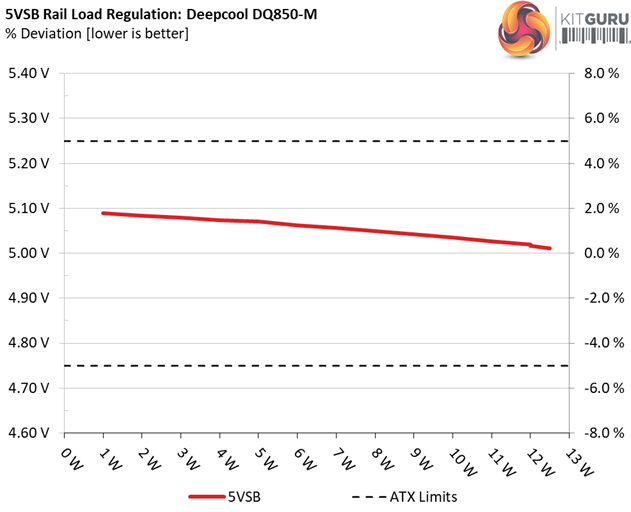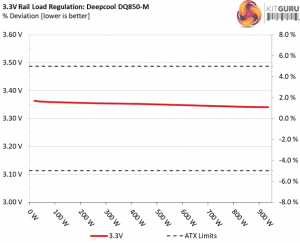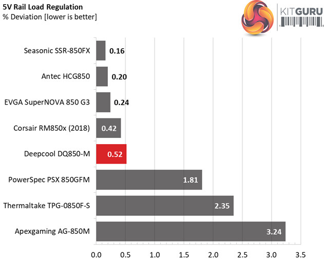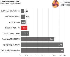The load regulation at +12V is tight enough, however it cannot compete against the performance of Seasonic's Focus platform. On the 5V and 3.3V rails the deviations are low as well and at 5VSB the load regulation is among the best in this category.