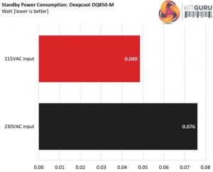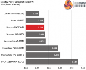 In the table below, you’ll find the power consumption and voltage values of all rails (except -12V) when the PSU is idle (powered on, but without any load on its rails), and the power consumption when the unit is in standby mode (without any load, at 5VSB).