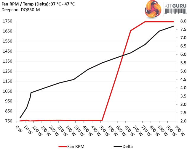 The first chart below illustrates the cooling fan's speed (in RPM), and the delta between input and output temperature. The results were obtained at 37°C (98.6°F) to 47°C (116.6°F) ambient temperature.