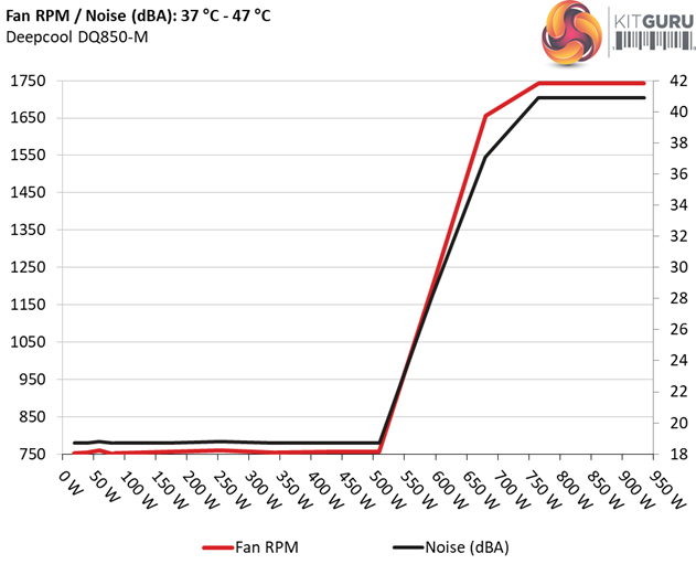 The following graph illustrates the fan's output noise over the PSU's operating range. The same conditions of the above graph apply to our measurements, though the ambient temperature is between 30°C (86°F) to 32°C (89.6°F).