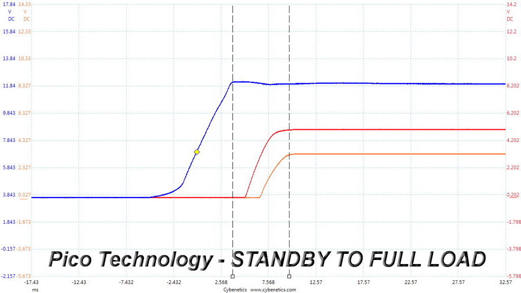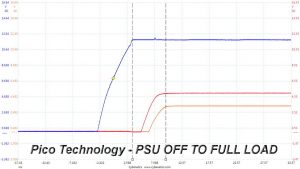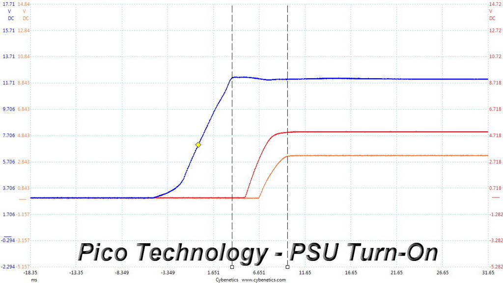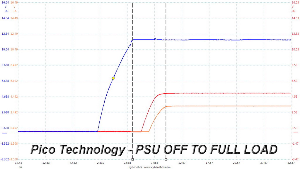 According to Intel’s most recent Power Supply Design Guide (revision 1.4) the +12V and 5V voltages must be equal or greater than the 3.3V rail’s output at all times, during the power-up and normal operation. For our first measurement, we turn the unit off and switch it back on without any load in any of the rails.