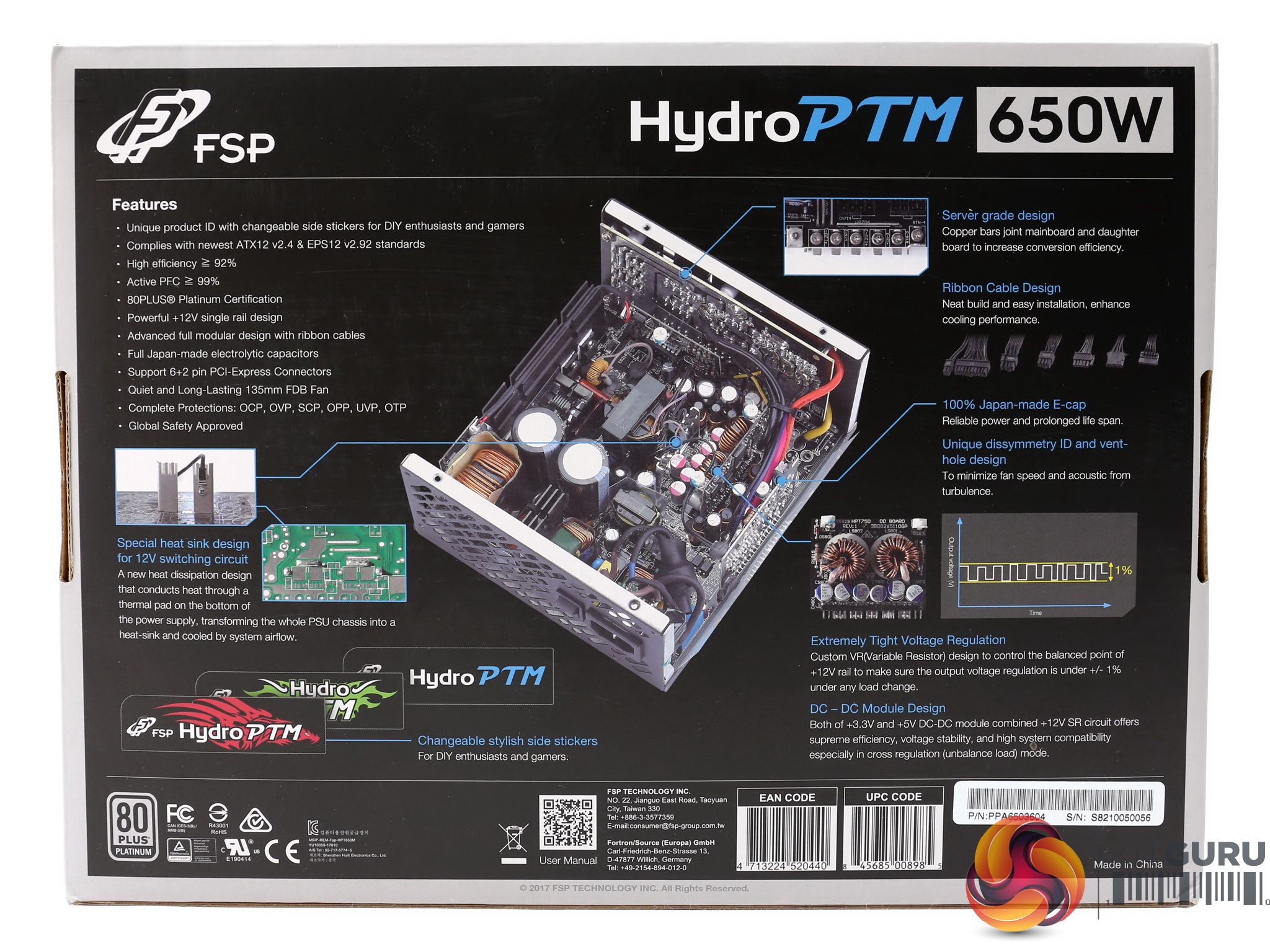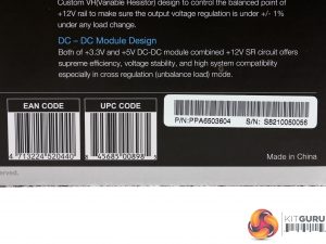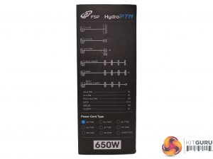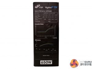 There is an interesting photo at the back of the box, showing the unit's internals. FSP provides a description of the platform's major features and there is a long feature list as well – mentioning some interesting information about the supply.