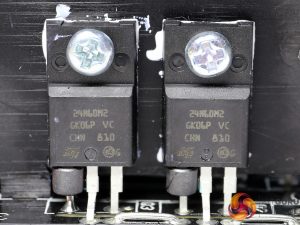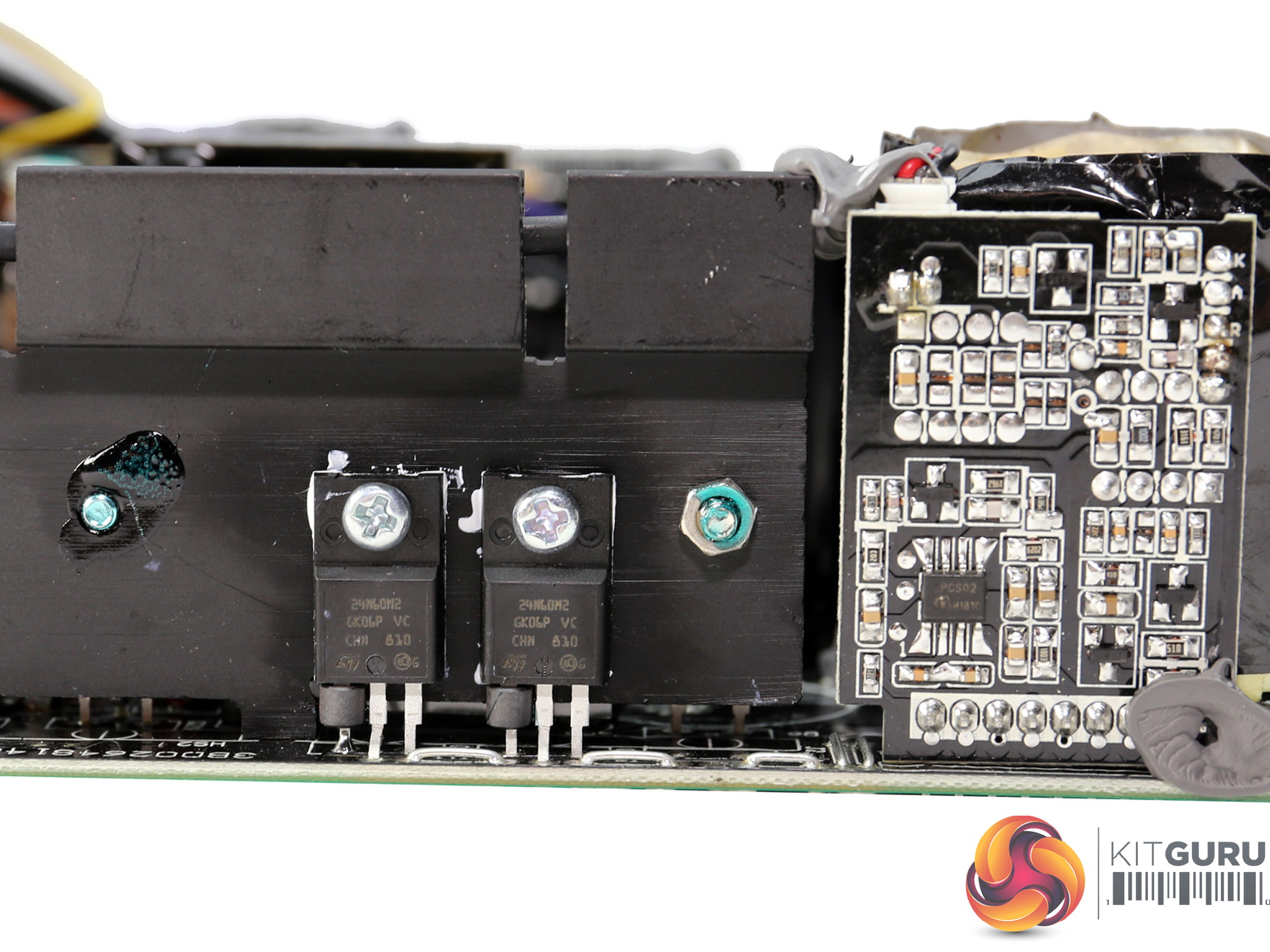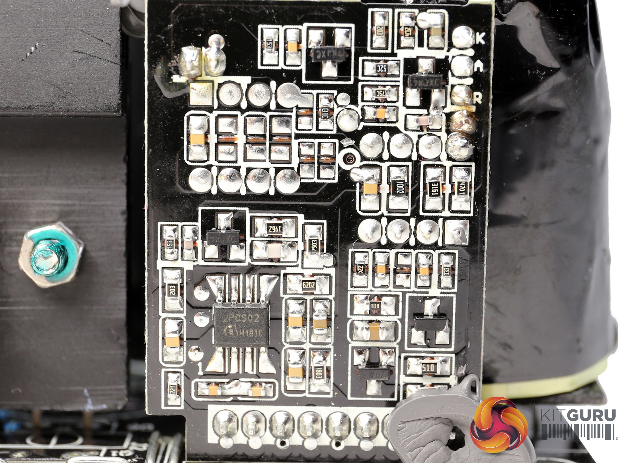 A couple of Toshiba TPHR85 04PL FETs regulate the +12V rail. They are installed on the solder side of the PCB, while two small heatsinks right above them assist in their cooling.