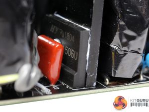 A single bridge rectifier (GBJ1506) is used. In high-end 650W units we usually find two of them, for increased amperage handling and mostly for lowering the power losses since they operate in parallel, so each one has to handle half the amperage.