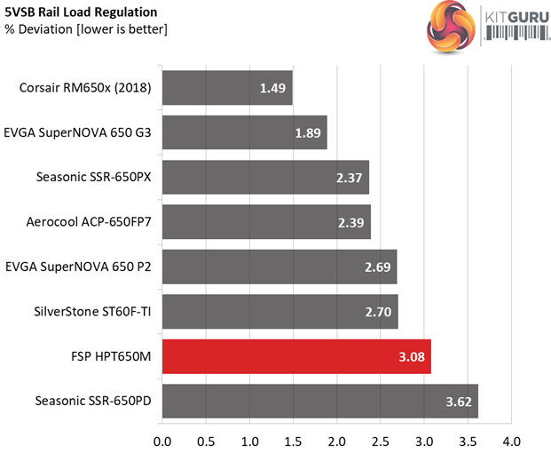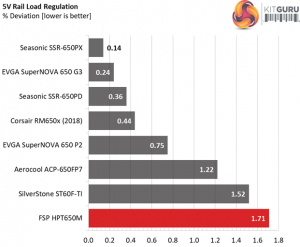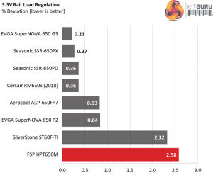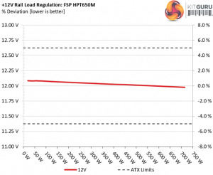 The load regulation at +12V is satisfactory and the 5V rail stays within 2%. The regulation at 3.3V could be much better though, since the competition is way ahead here. This rail might not be so important nowadays, but from the moment it is included in the ATX spec and some components still use it, it should have the best possible performance.