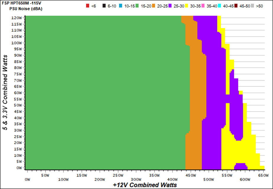 The next chart shows the cooling fan's speed (again, in RPM) and output noise. We measure acoustics from one meter away, inside a hemi-anechoic chamber. Background noise inside the chamber is below 6 dB(A) during testing (it's actually much lower, but our sound meter microphone hits its floor), and the results are obtained with the PSU operating at 37°C (98.6°F) to 47°C (116.6°F)