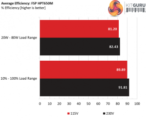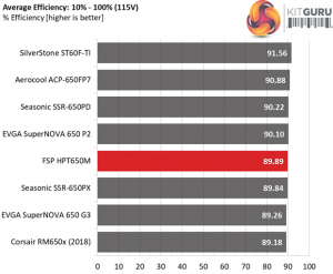 The efficiency with normal loads is high, following closely the Leadex and Prime Platinum platforms. Under light loads FSP's offer has decent performance, however it has a hard time catching up with the competition. Even the 80 PLUS Gold rated, EVGA 650 G3 is ahead of it.