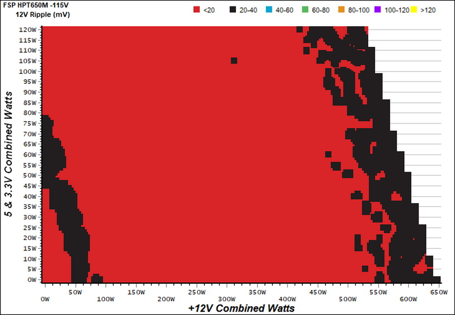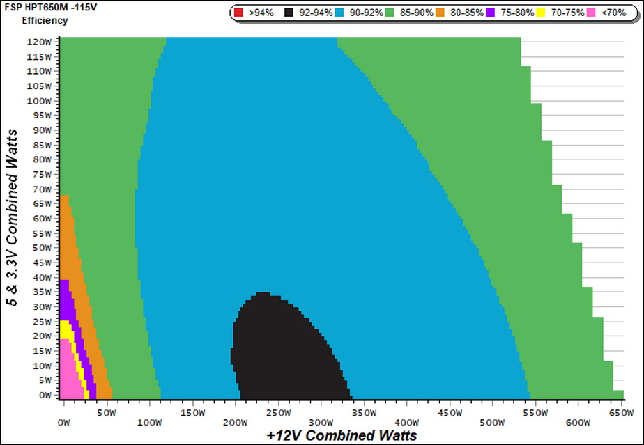 It is good to see a region where efficiency is higher than 92%. From around 110W to 540W at +12V and even with very high loads on the minor rails, the PSU's efficiency stays above 90%.