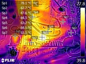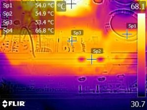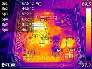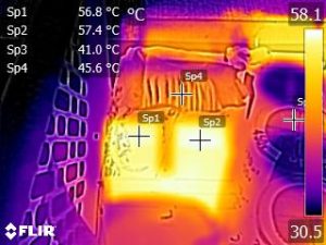 We apply half-load for 10 minutes with the PSU’s top cover and cooling fan removed before taking photos with our modified FLIR E4 camera that delivers 320×240 IR resolution (76,800 pixels).