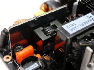 The main transformer of the unit. Right next to it is the resonant tank and the capacitive components of the LLC resonant converters, a couple of X caps. There is also a shield between the transient filter and the resonant tank, providing protection against radiated EMI.