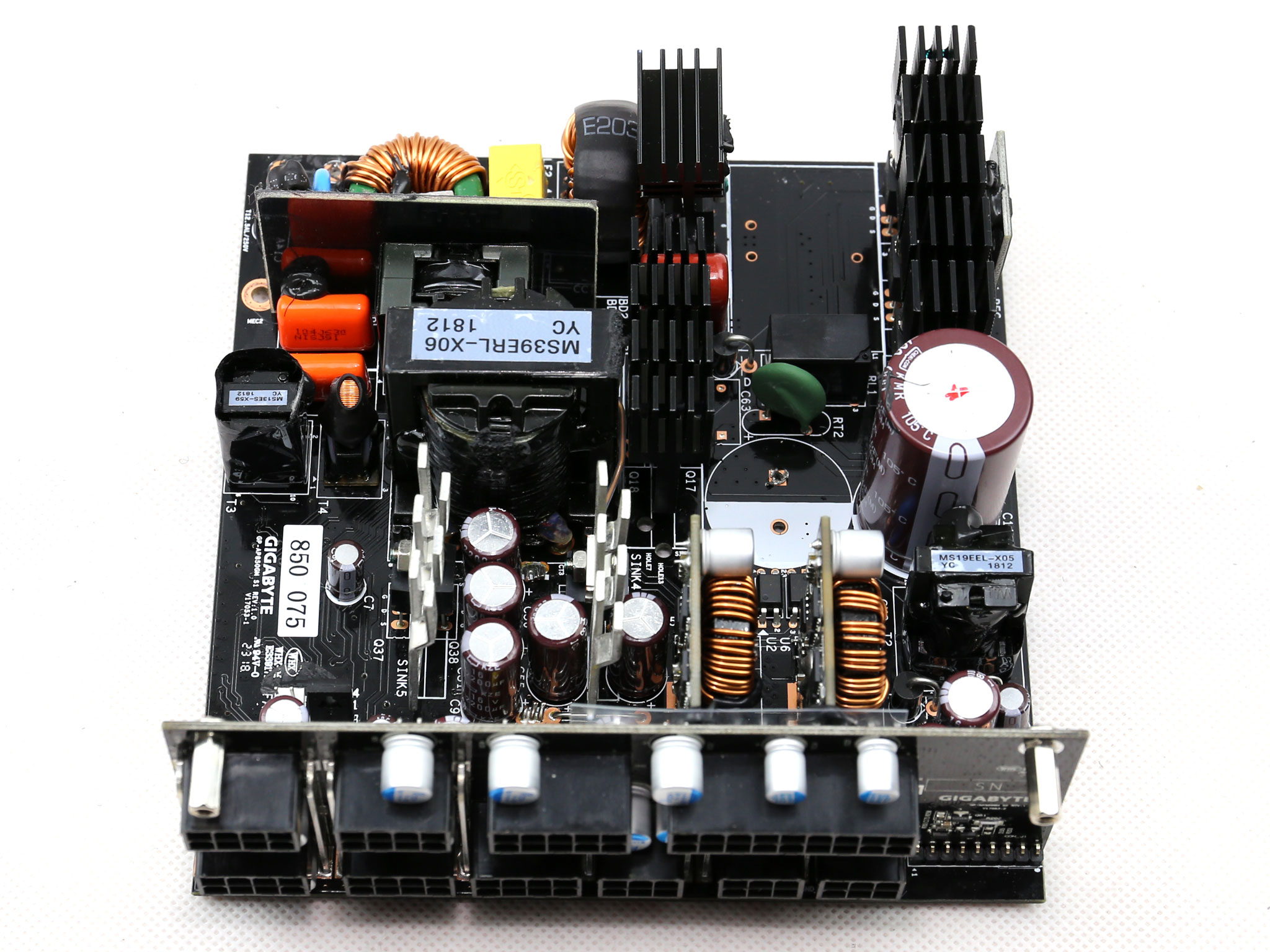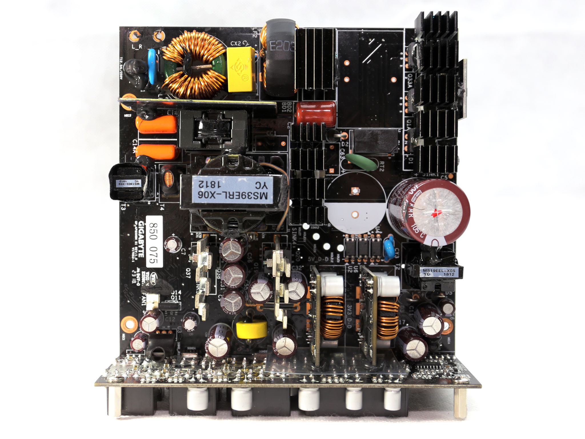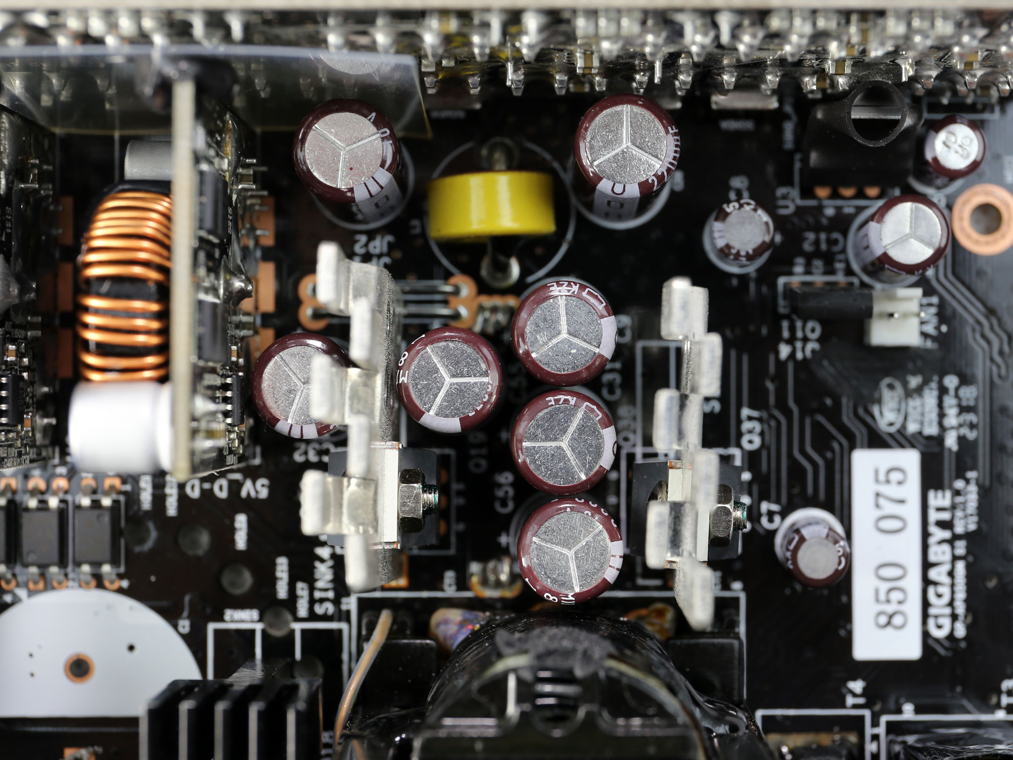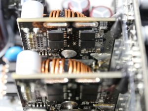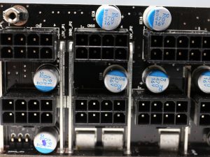 At the front side of the modular PCB, which is connected to the main board through a number of bus bars, a number of polymer Chemi-Con caps provides an extra ripple suppression layer.