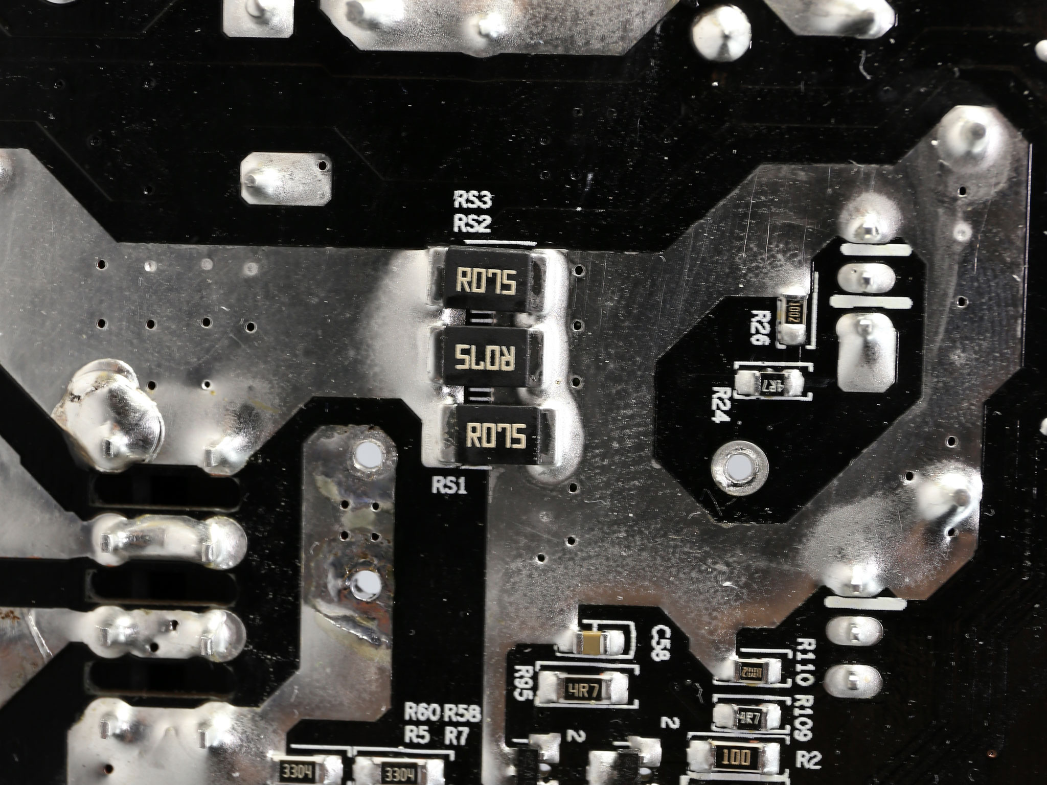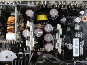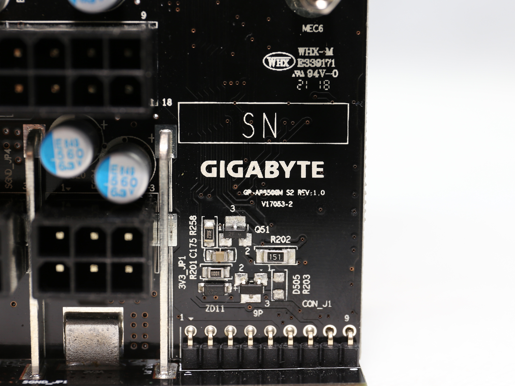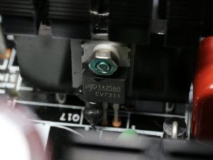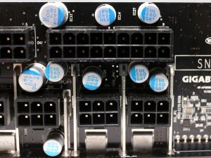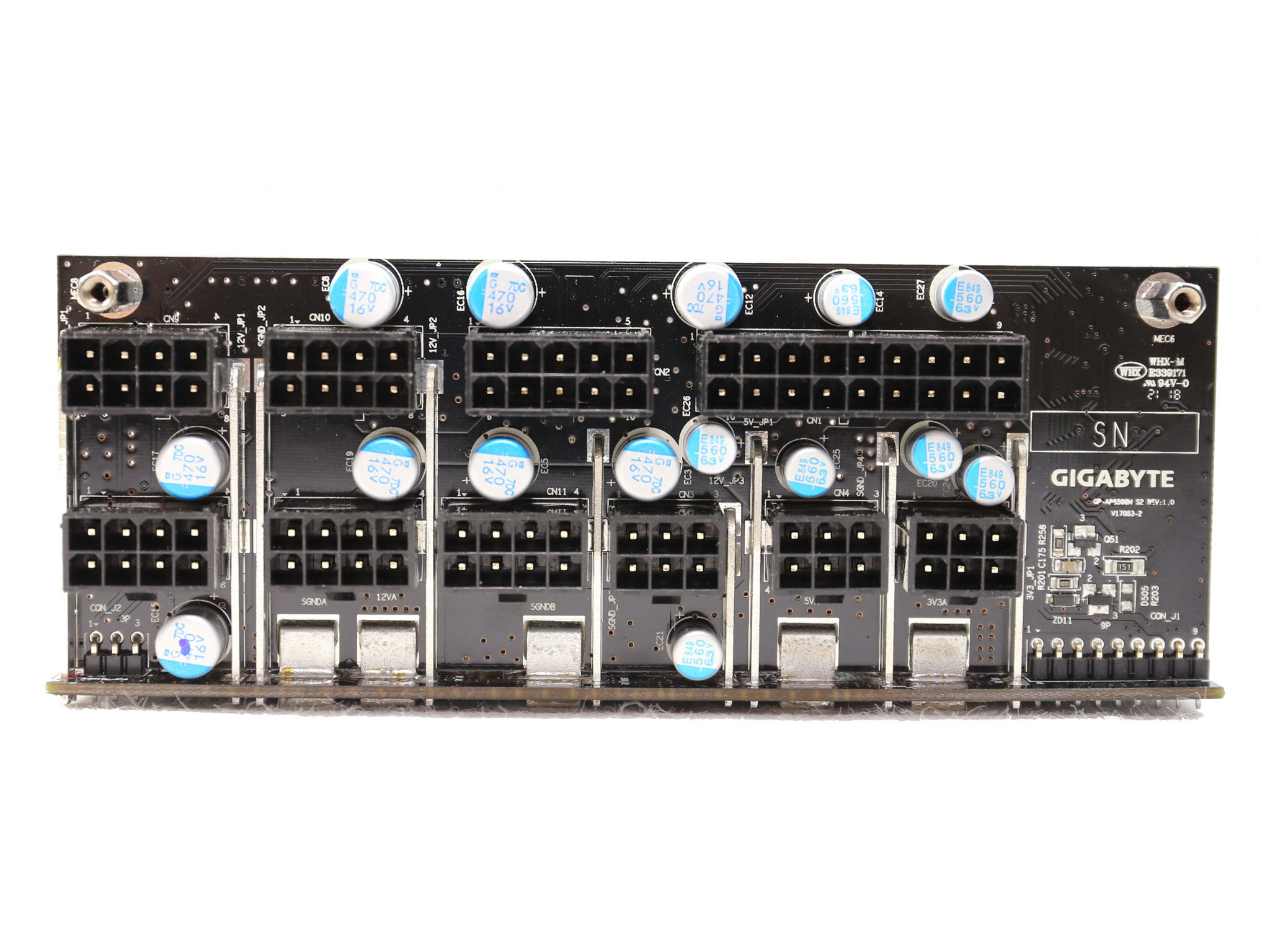 At the front side of the modular PCB, which is connected to the main board through a number of bus bars, a number of polymer Chemi-Con caps provides an extra ripple suppression layer.