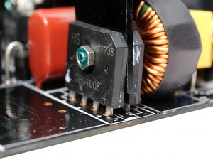 The couple of bridge rectifiers is installed on a leaning heat sink. Combined the pair of GBU1006 rectifiers can handle up to 20 Amps of current.