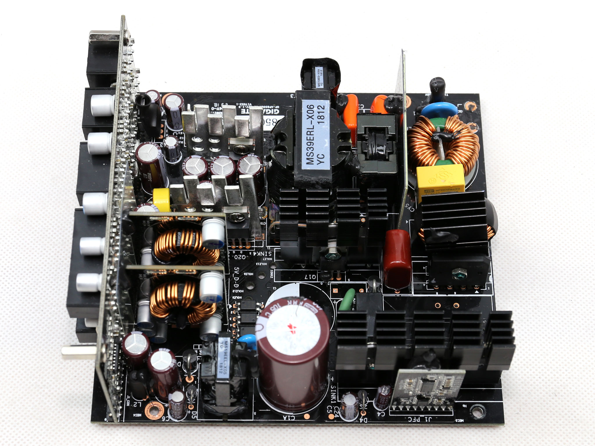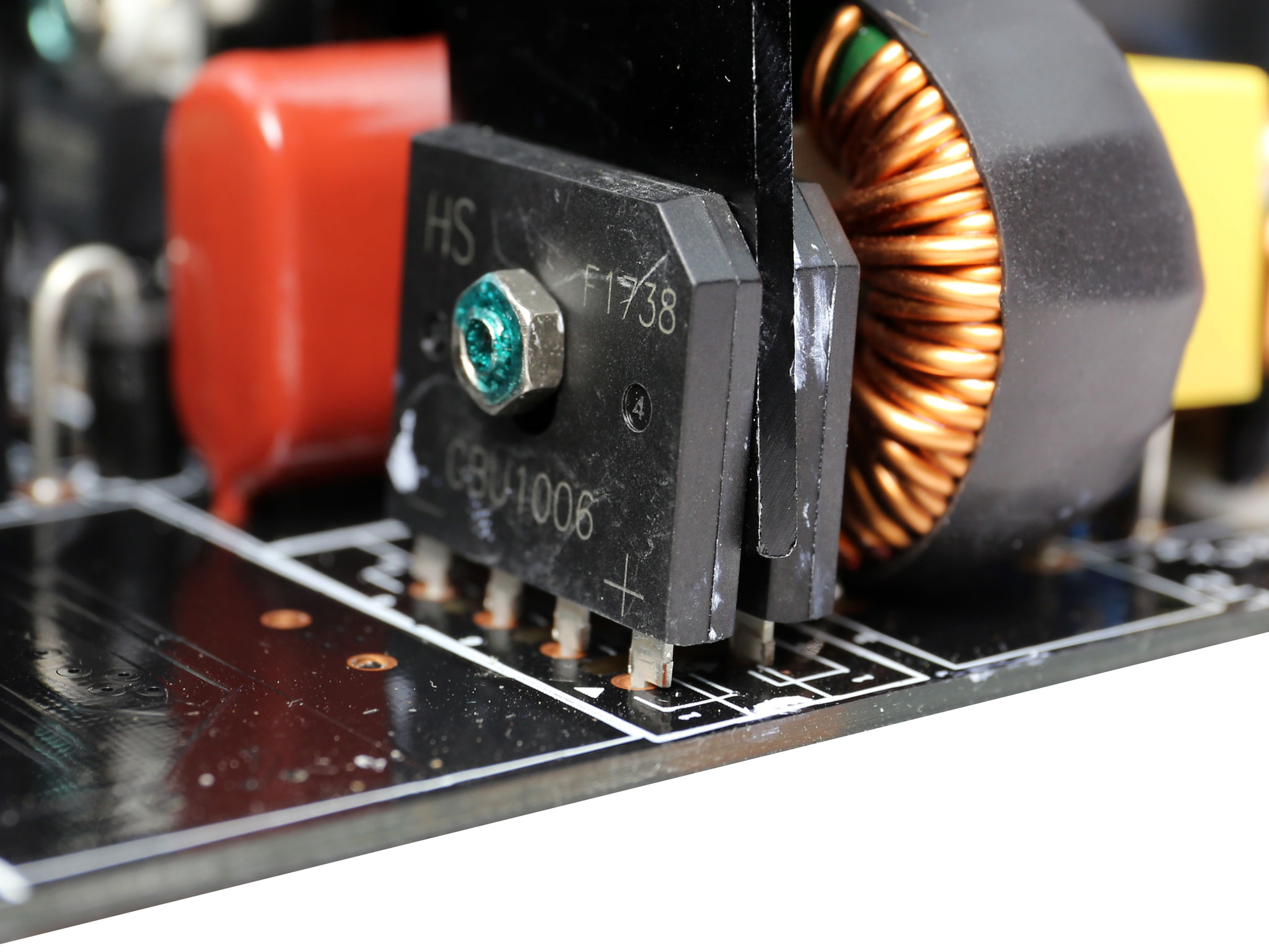 The PFC controller is a Champion CM6500UNX IC, which is supported by a CM03X Green PFC controller that lowers power consumption in standby mode. Both are installed onto a small vertical board.