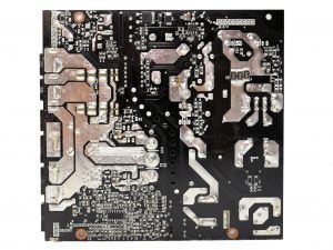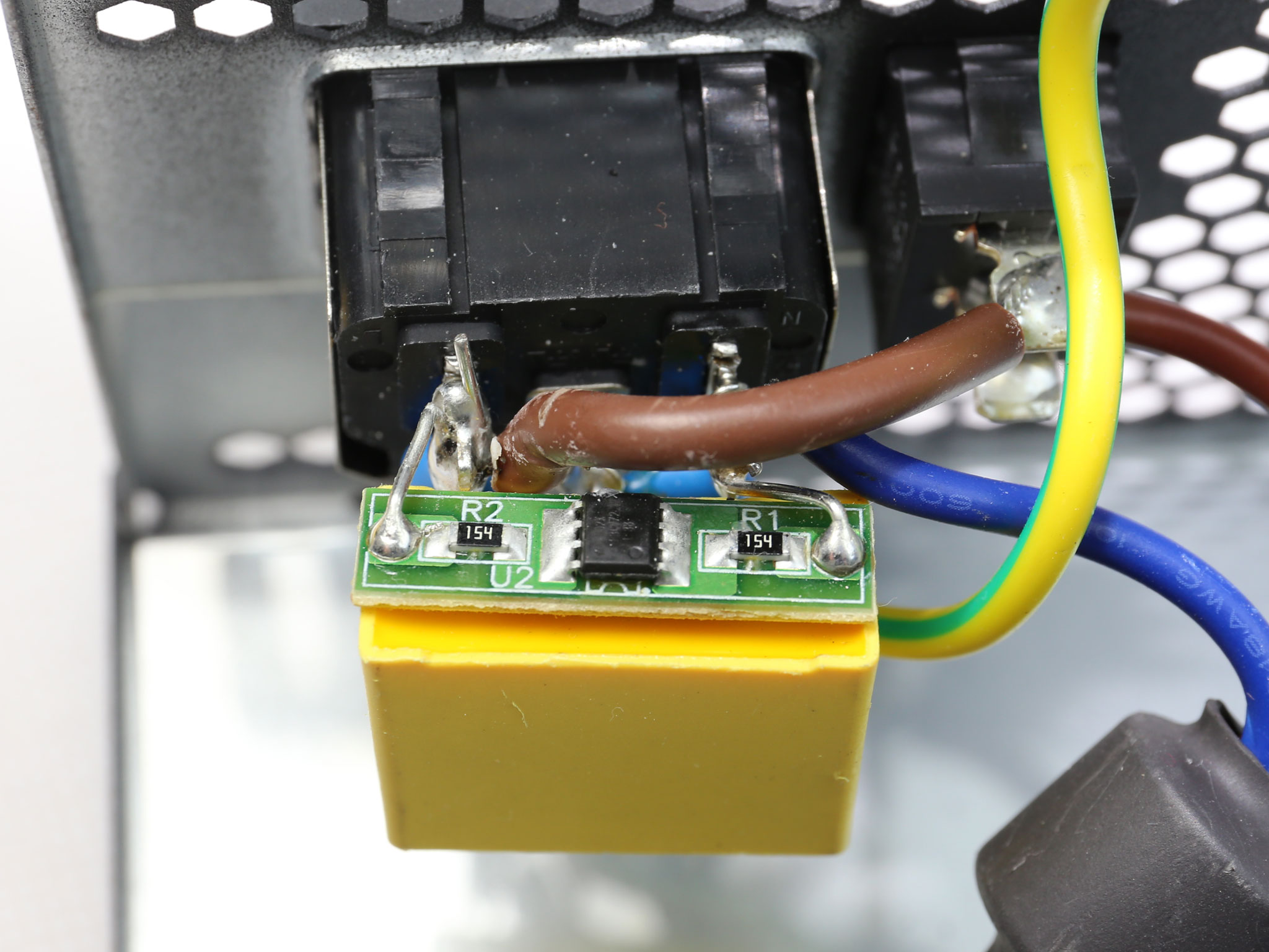 The first part of the transient filter resides on a small PCB and includes one X and two Y caps, along with a CM02X IC, which blocks the X cap's discharge resistors once power is connected. The second part of the EMI filter is on the main PCB and consists of one X and two Y caps, two CM chokes and an MOV (Metal Oxide Varistor).