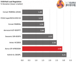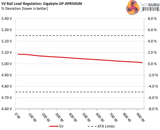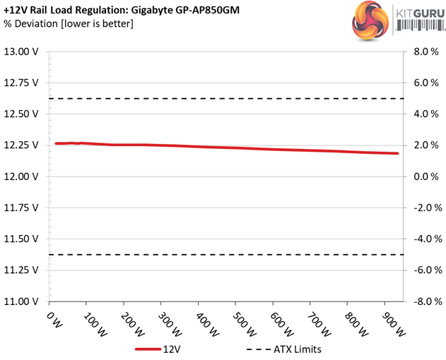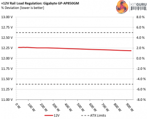 The first set of tests reveals the stability of the voltage rails and the GP-AP850GM’s efficiency. The applied load equals (approximately) 10 to 110 percent of the power supplies maximum load in increments of 10 percentage points.