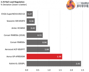 The load regulation at +12V is tight enough, while on the 5V and 3.3V rails stays within 2%. At 5VSB is at 2.9% so it could use some more tuning, although load regulation on this rail isn't of great importance. In the efficiency section, the PSU easily meets the 80 PLUS Gold requirements, although we test at a much higher ambient than the 80 PLUS organisation, where efficiency takes a big hit.