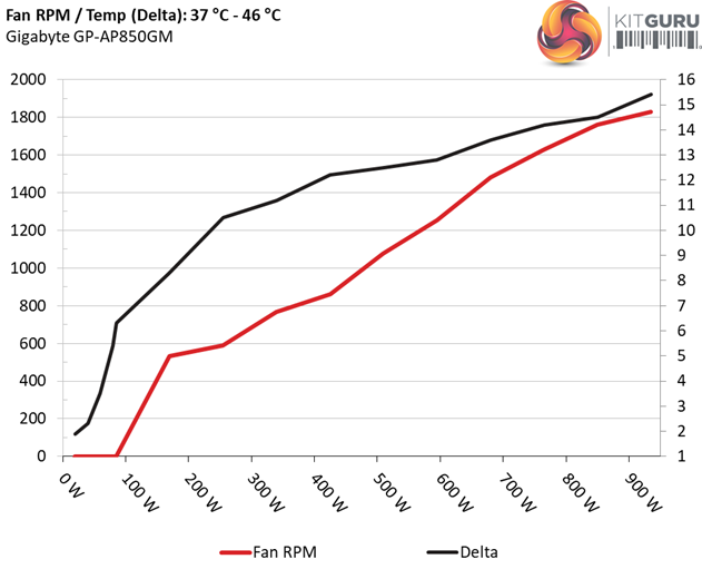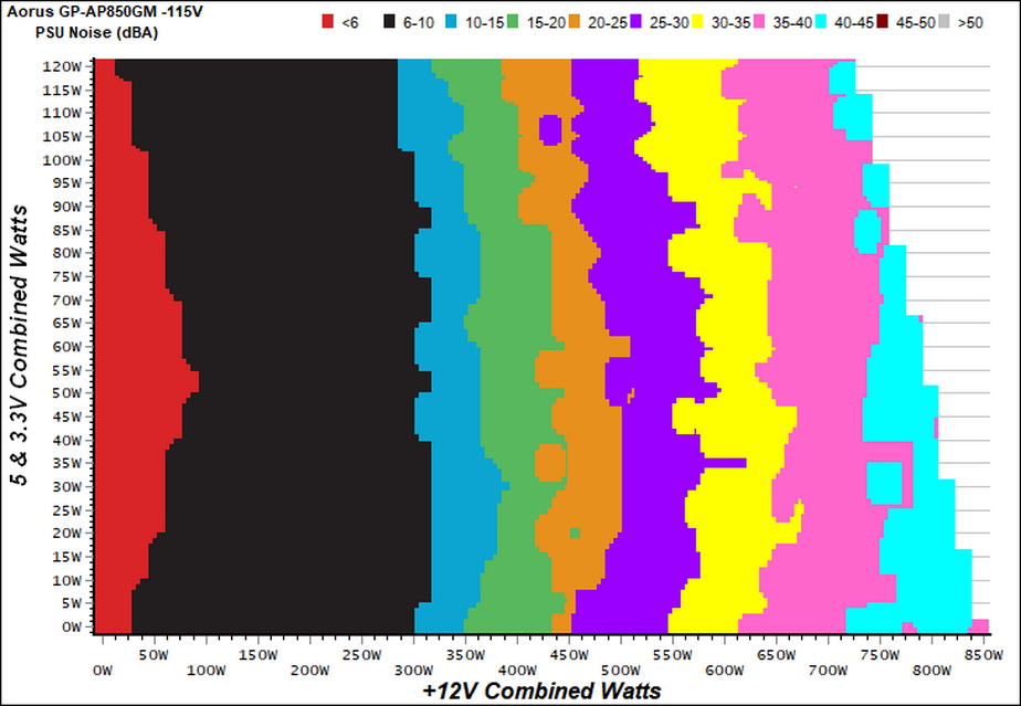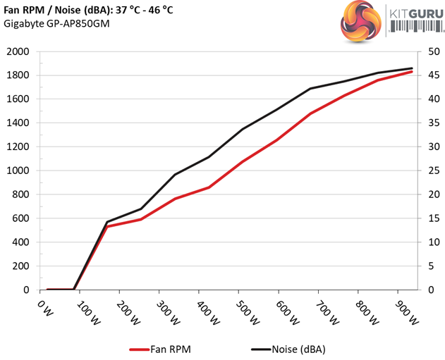 The next chart shows the cooling fan's speed (again, in RPM) and output noise. We measure acoustics from one meter away, inside a hemi-anechoic chamber. Background noise inside the chamber is below 6 dB(A) during testing (it's actually much lower, but our sound meter’s microphone hits its floor), and the results are obtained with the PSU operating at 37°C (98.6°F) to 46°C (114.8°F) ambient temperature.