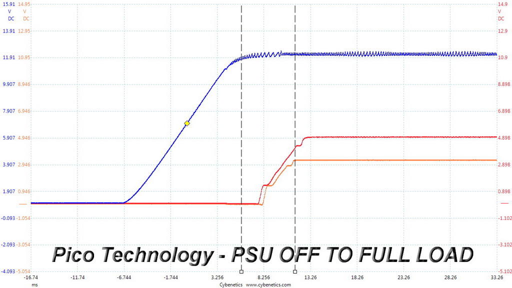 According to Intel’s most recent Power Supply Design Guide (revision 1.4) the +12V and 5V voltages must be equal or greater than the 3.3V rail’s output at all times, during the power-up and normal operation. For our first measurement, we turn the unit off and switch it back on without any load in any of the rails.