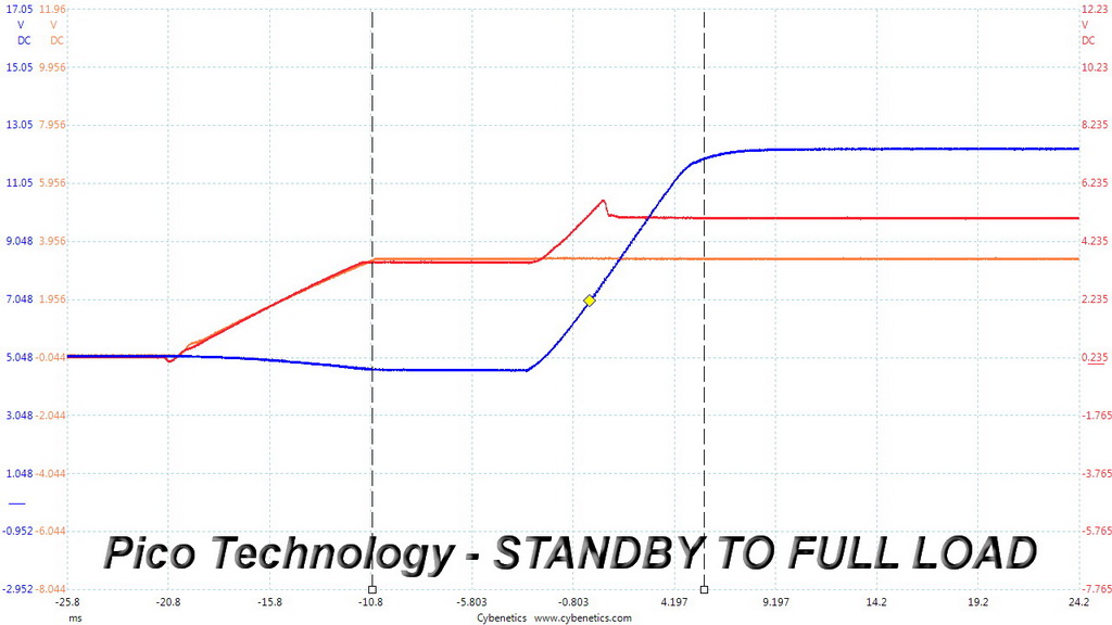It looks like that we have a problem here, since the +12V rail starts late as you can clearly see in the first two scope shots. This means that the 3.3V rail is at a higher level than 12V, during the PSU's start up and there is also a cross correlation between the 3.3V and 5V rails. MEIC has to fix this platform's power sequencing according to Intel's specifications. Strangely enough during the last test “PSU Off to Full Load” the +12V rail starts to rise before 3.3V.