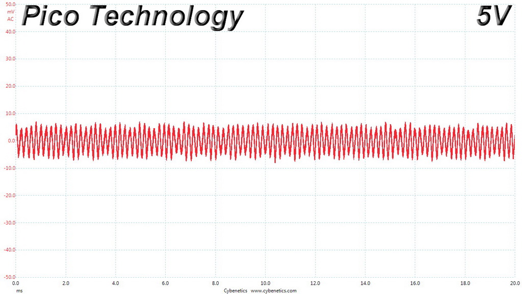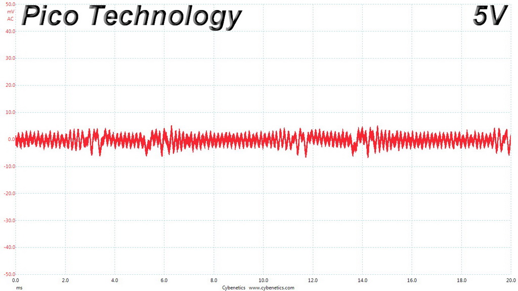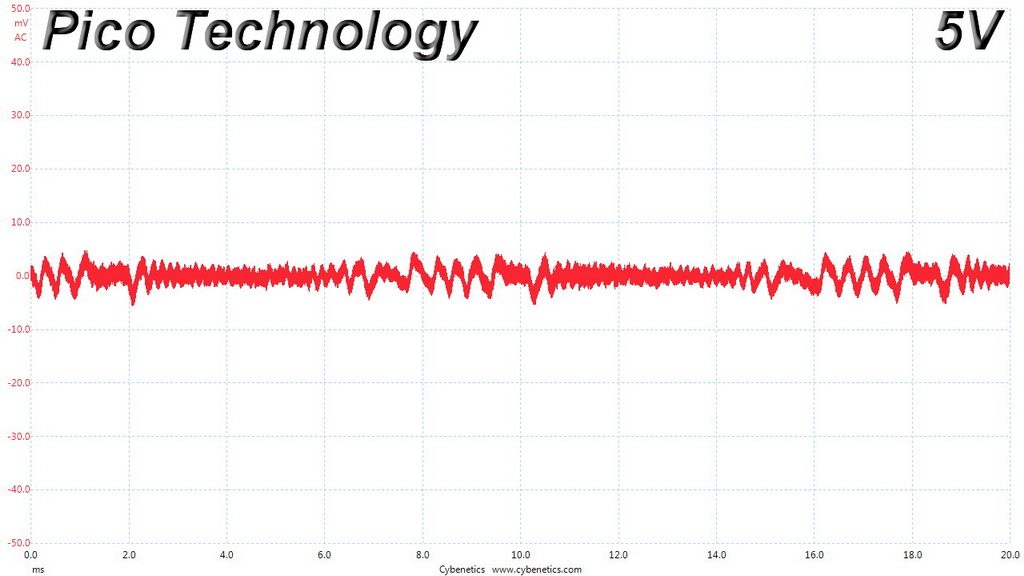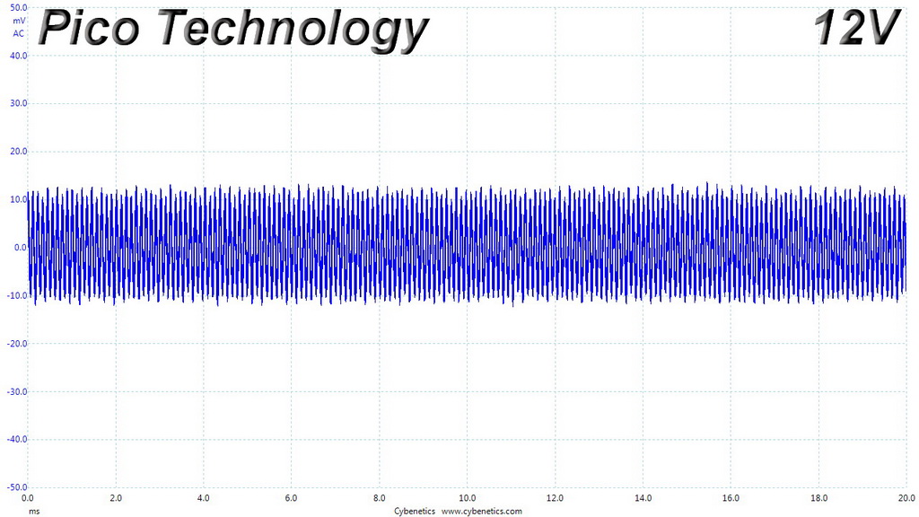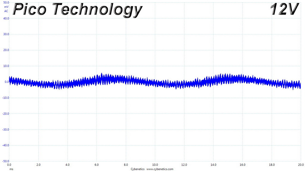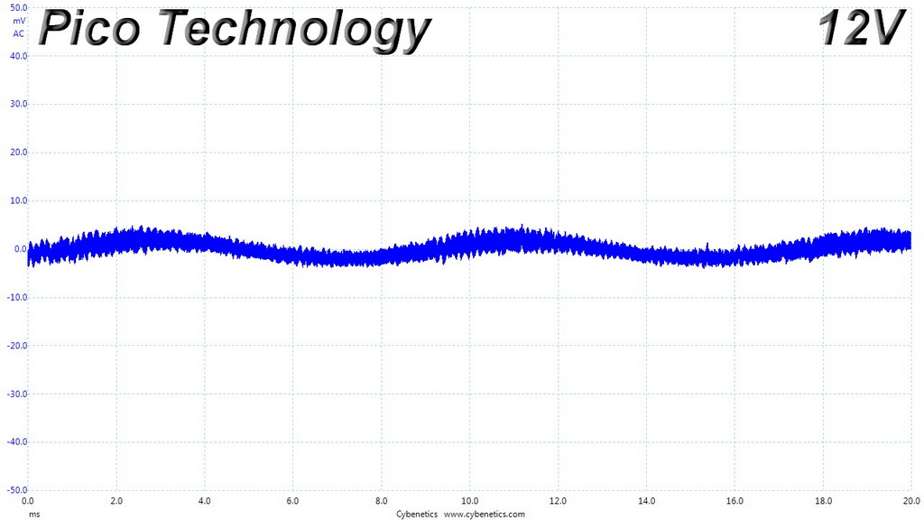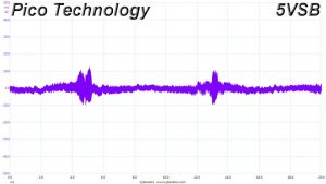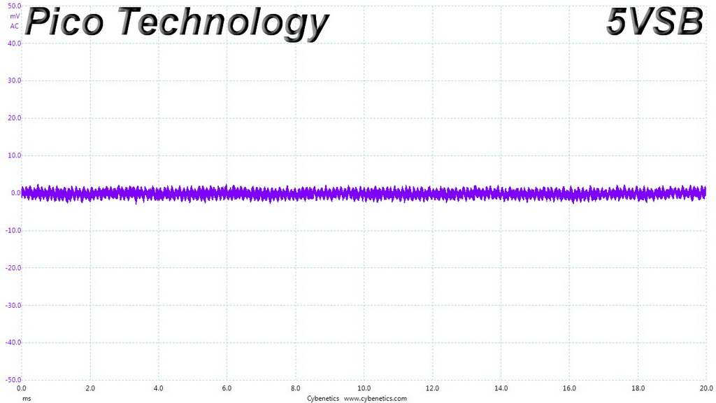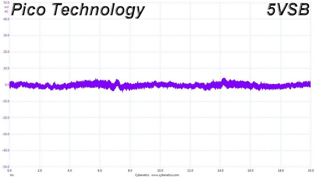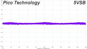 The following oscilloscope screenshots illustrate the AC ripple and noise registered on the main rails (+12V, 5V, 3.3V and 5VSB). The bigger the fluctuations on the screen, the bigger the ripple/noise. We set 0.01 V/Div (each vertical division/box equals 0.01V) as the standard for all measurements.