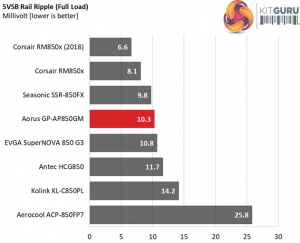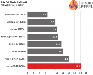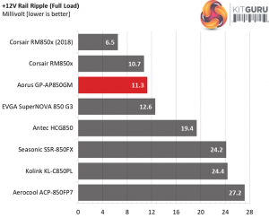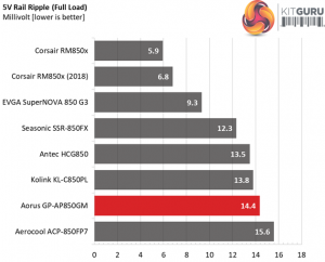 The following table includes the ripple levels we measured on the GP-AP850GM’s rails. The limits, according to the ATX specification, are 120mV (+12V) and 50mV (5V, 3.3V, and 5VSB).
