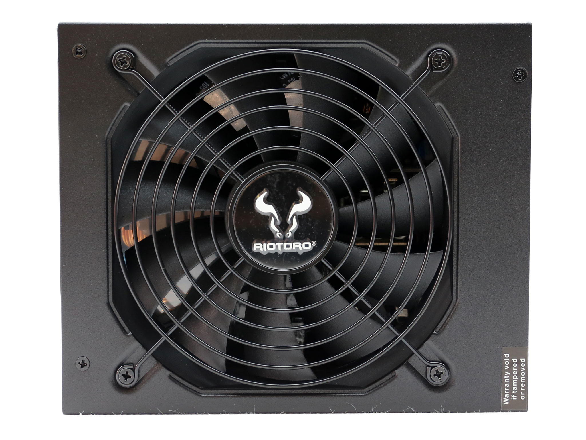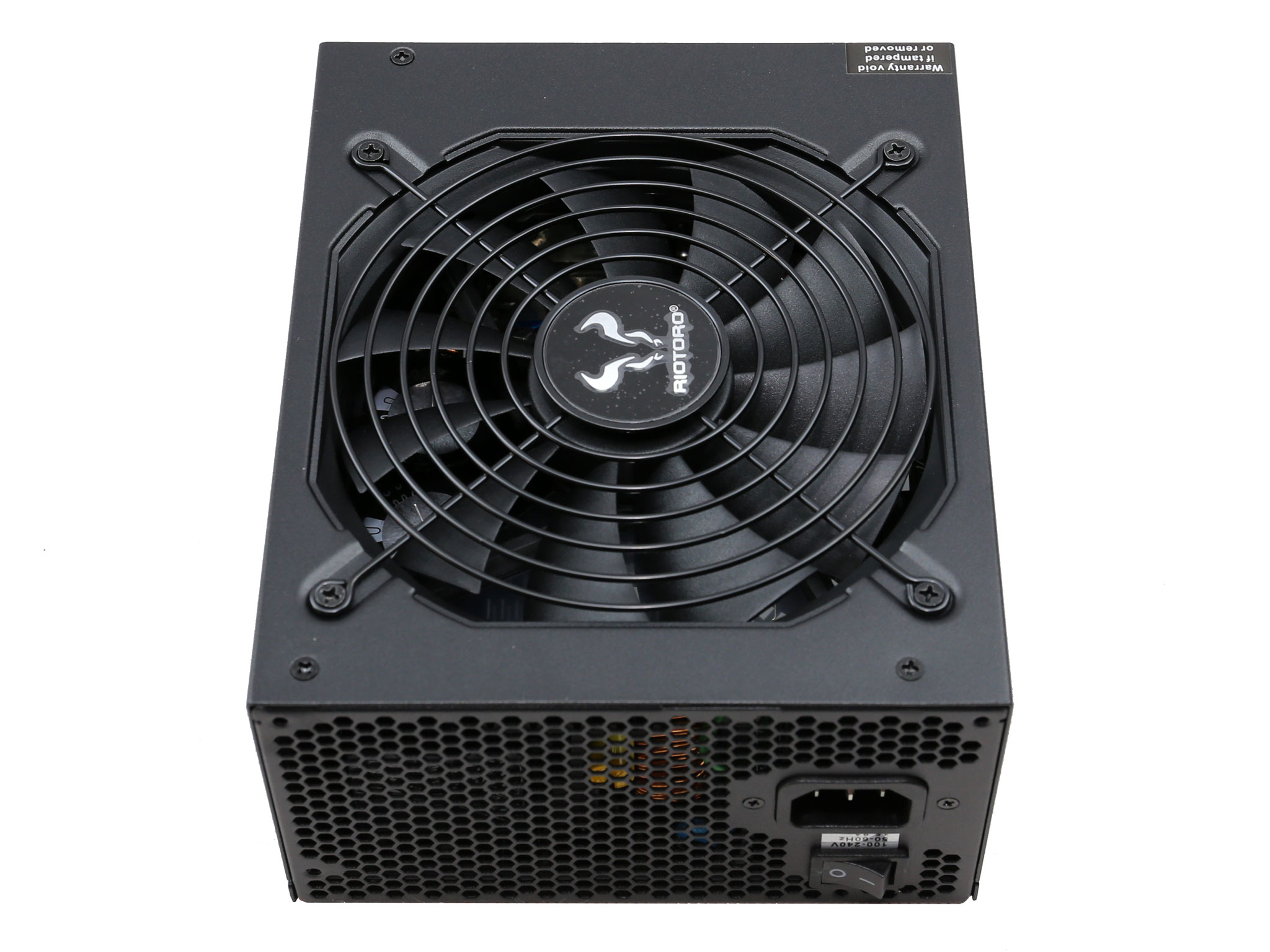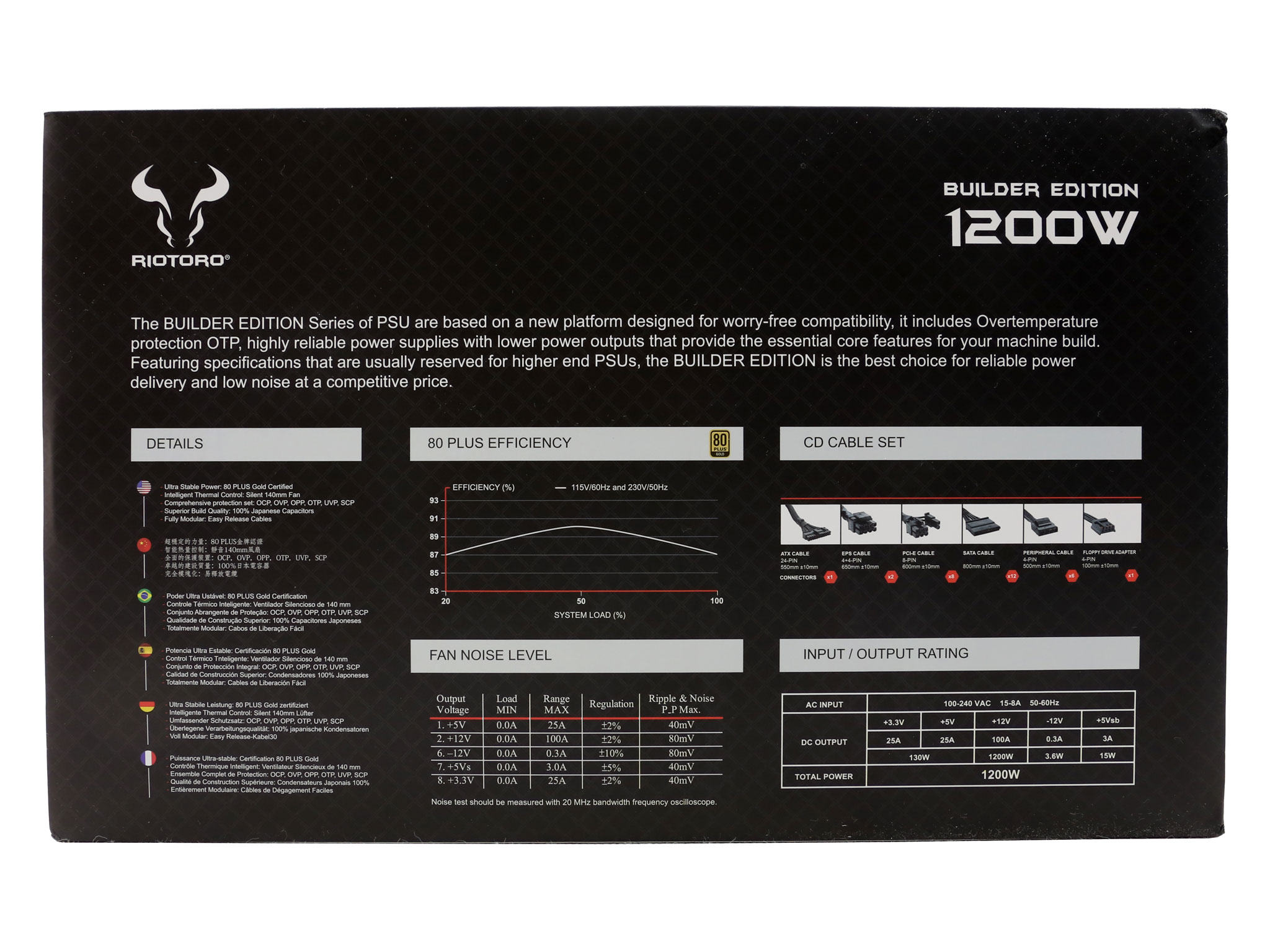 At the rear side of the box, Riotoro provides some details about the PSU in six languages along with a brief description. You will also find here the 80 PLUS efficiency curve along with a list depicting the available cables and the power specifications table. There is a mention of the fan noise levels but apparently someone forgot to include the corresponding chart.