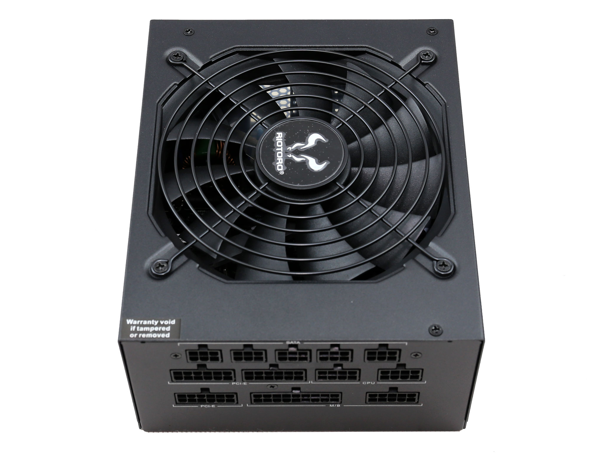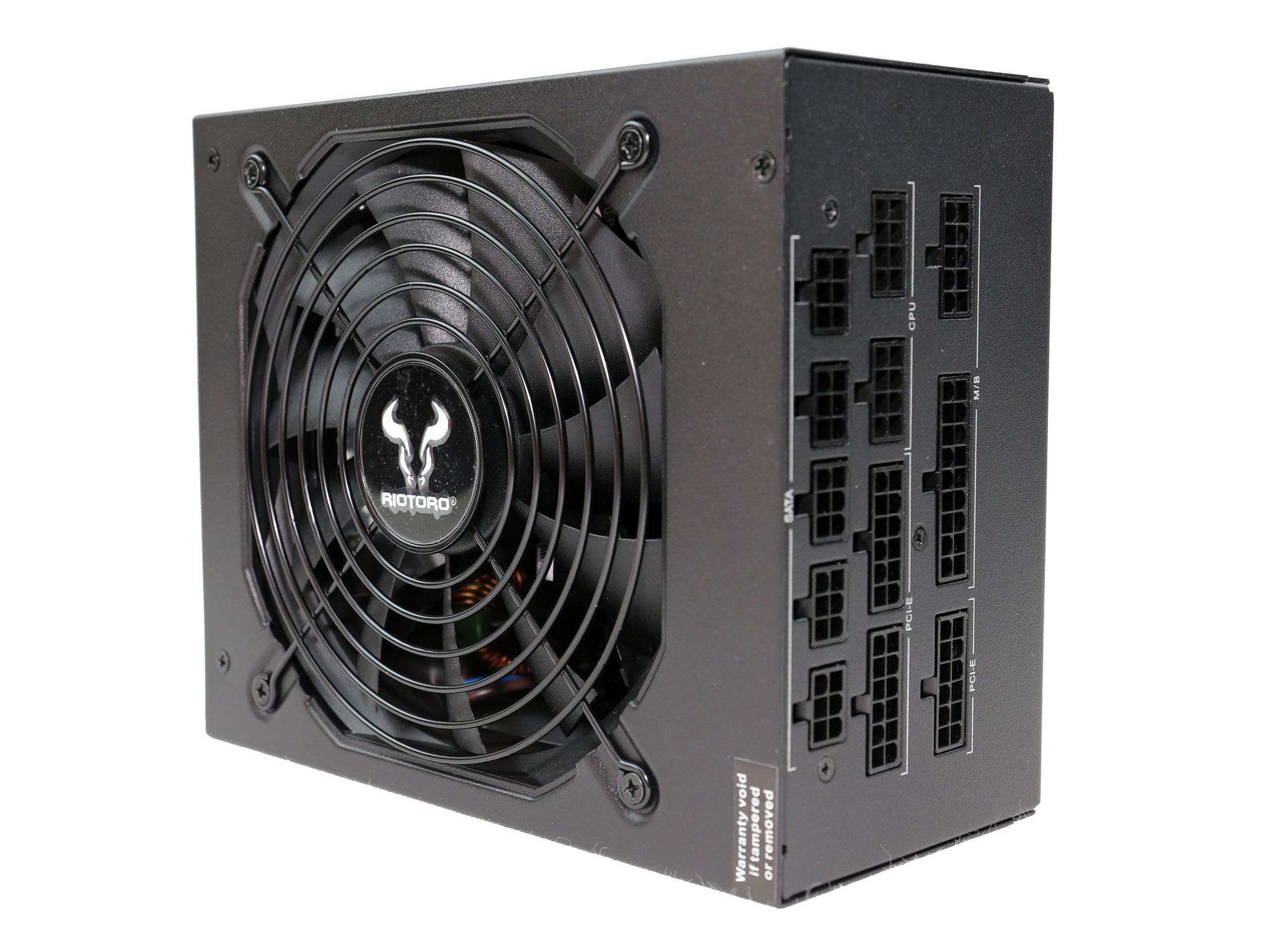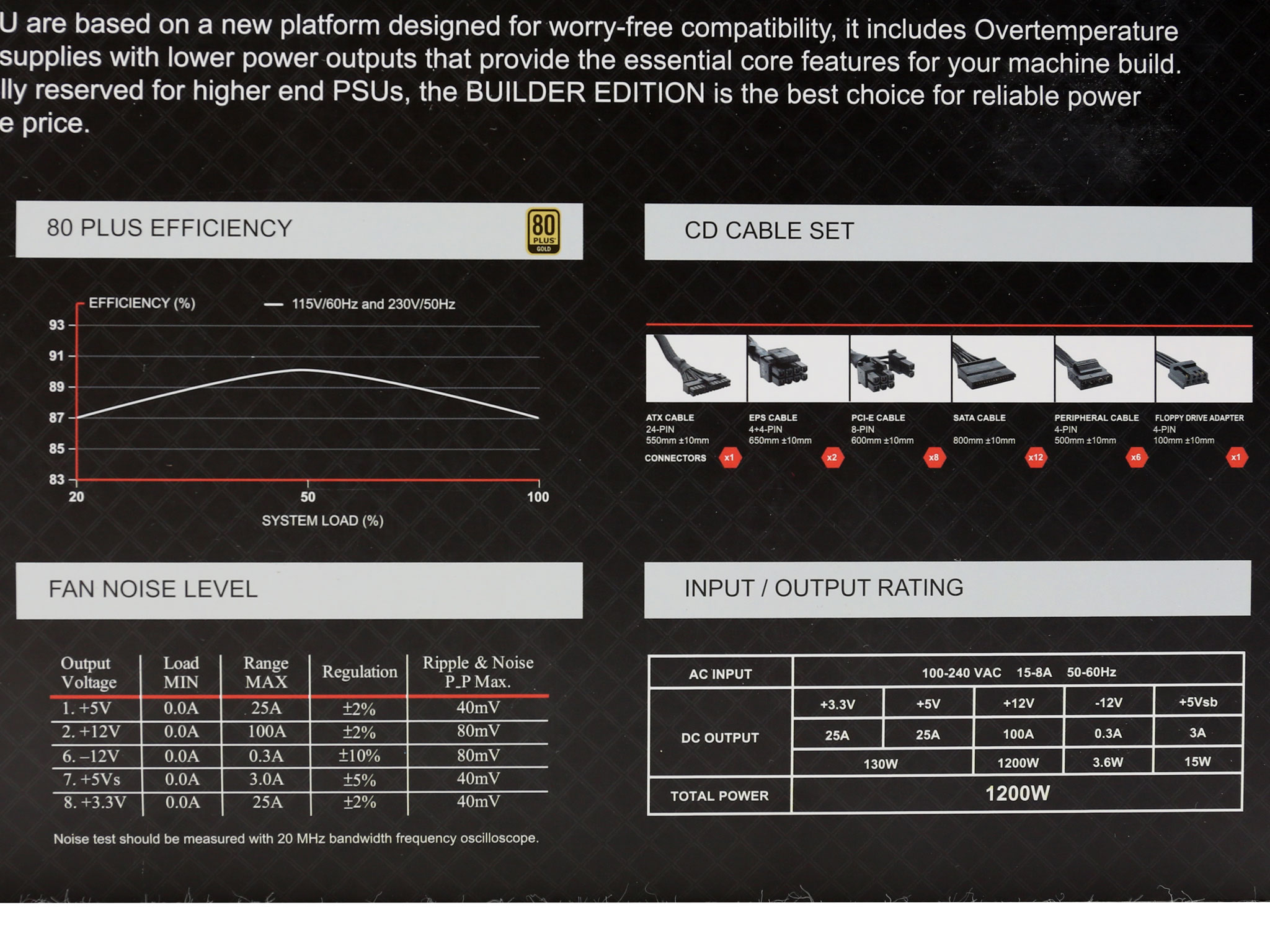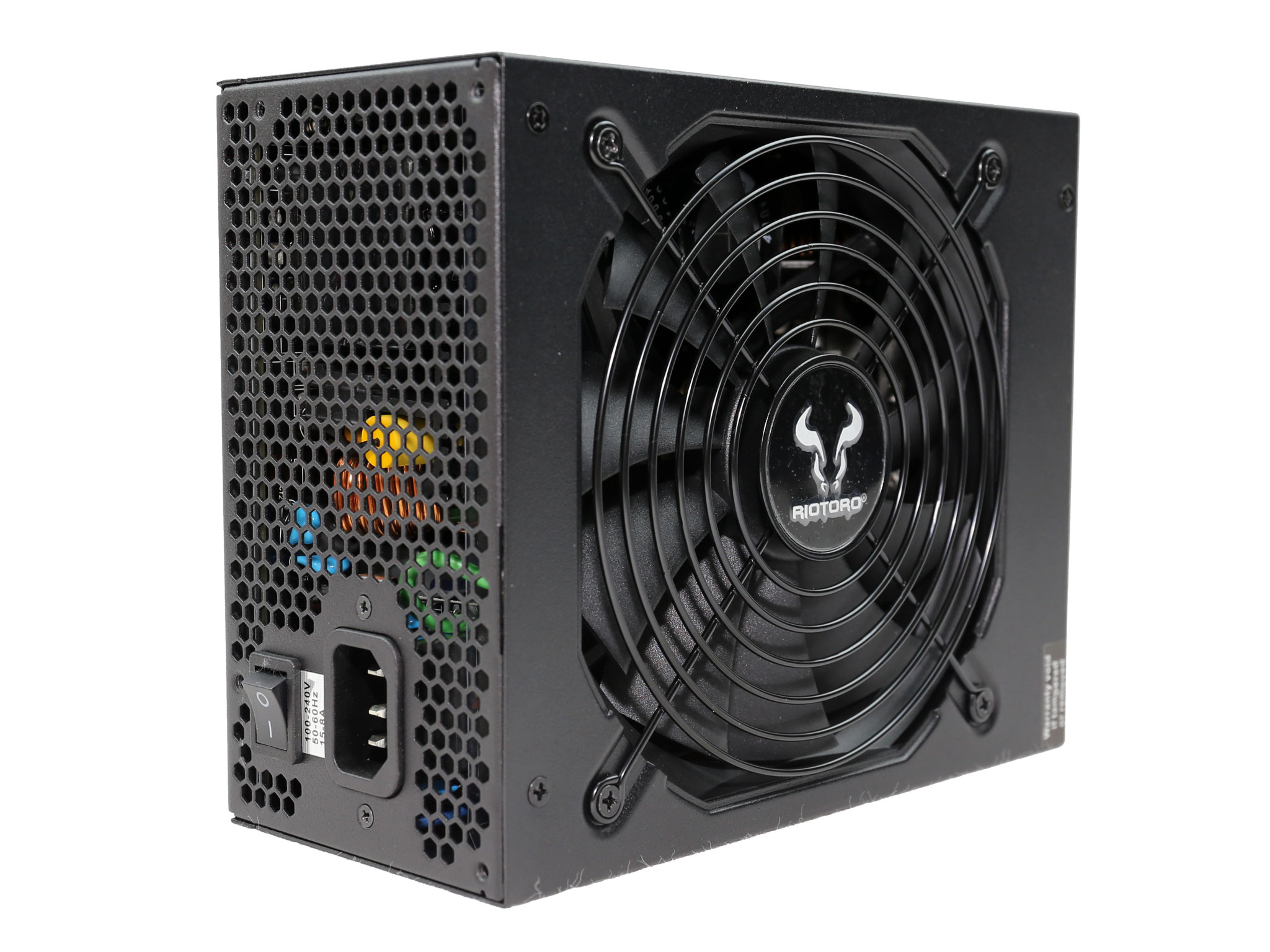 At the rear side of the box, Riotoro provides some details about the PSU in six languages along with a brief description. You will also find here the 80 PLUS efficiency curve along with a list depicting the available cables and the power specifications table. There is a mention of the fan noise levels but apparently someone forgot to include the corresponding chart.