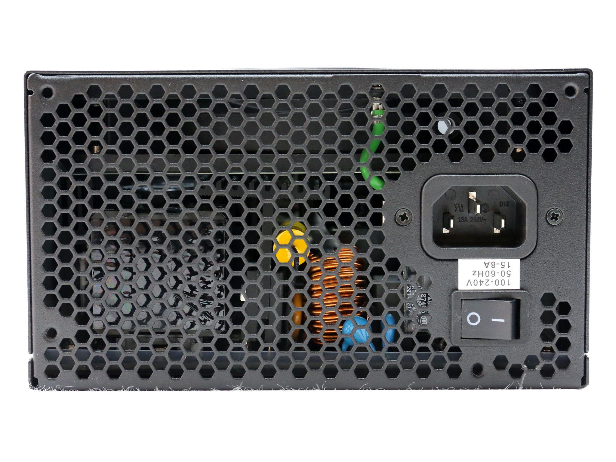 The PSU's dimensions are on the large side, while at its front side we see the typical honeycomb-style exhaust grille along with the AC receptacle and a small power switch.