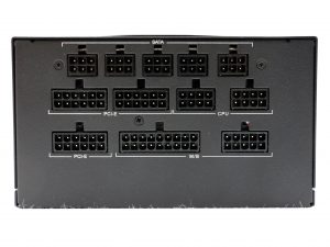 The fully modular panel includes twelve sockets which is enough to use all of the provided cables and connectors at the same time. We are worried, though, about the single 12-pin socket that will host the cable that includes four 6+2 pin PCIe connectors, which can take huge stress if power hungry GPUs are fed through the cable. Normally no more than a pair of PCIe connectors should be fed through those 12-pin sockets. As it seems, though, there was no space for four of those sockets on the modular panel, so High Power had to do things this way.