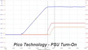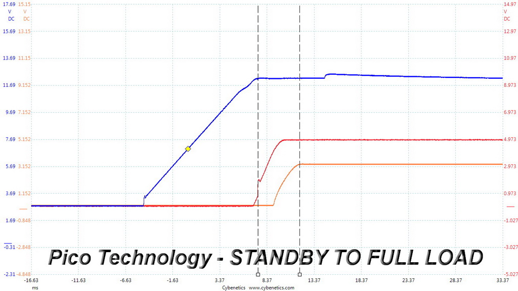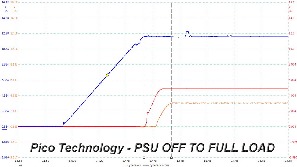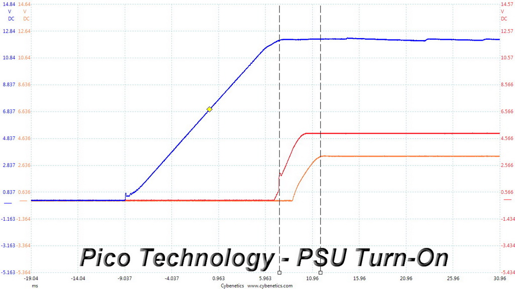 According to Intel’s most recent Power Supply Design Guide (revision 1.4) the +12V and 5V voltages must be equal or greater than the 3.3V rail’s output at all times, during the power-up and normal operation. For our first measurement, we turn the unit off and switch it back on without any load in any of the rails.