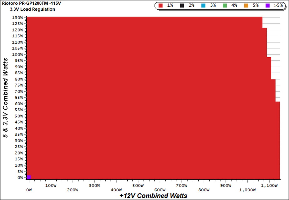 To generate the following charts, we set our loaders to auto mode through our custom-made software before trying more than 1500 possible load combinations with the +12V, 5V, and 3.3V rails. The load regulation deviations in each of the charts below are calculated by taking the nominal values of the rails (12V, 5V, and 3.3V) as point zero. The ambient temperature is between at 30°C (86°F) to 32°C (89.6°F).