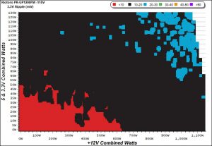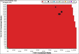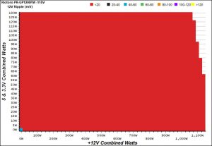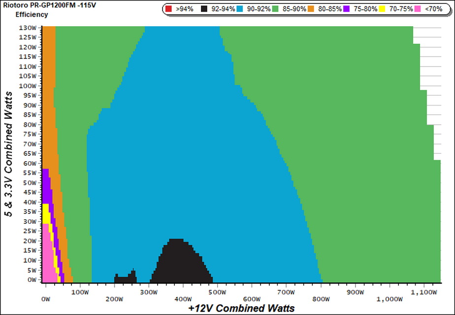 There are two small regions where the efficiency levels exceed 92%. In the majority of cases this is a clear indication of a “good” 80 PLUS Gold unit.