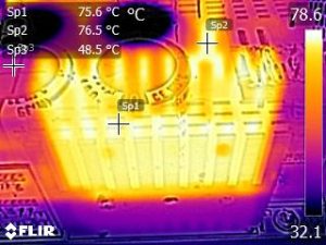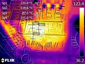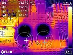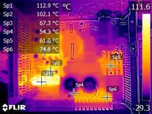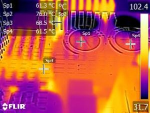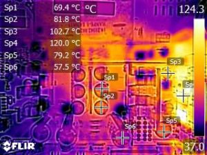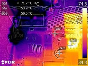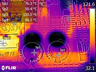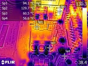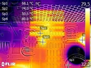 We apply half-load for 10 minutes with the PSU’s top cover and cooling fan removed before taking photos with our modified FLIR E4 camera that delivers 320×240 IR resolution (76,800 pixels).