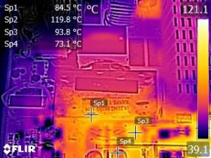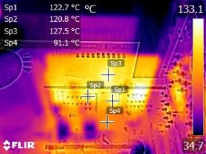 We measure high temperatures on the DC-DC converters, because we push them enough with close to 10 Amps load on each of the minor rails. The temperatures on the rest of the parts are low enough given the operating conditions.