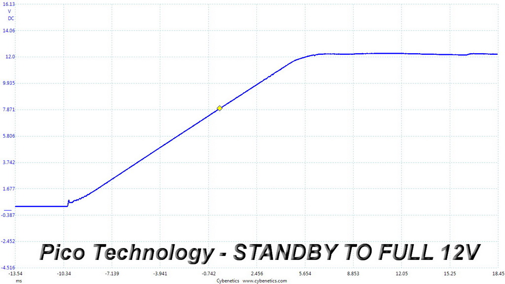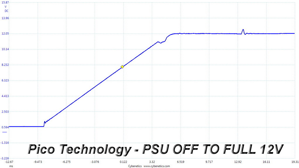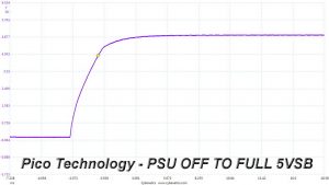 In the next set of tests, we measure the PR-GP1200FM’s response in simpler transient load scenarios—during its power-on phase.