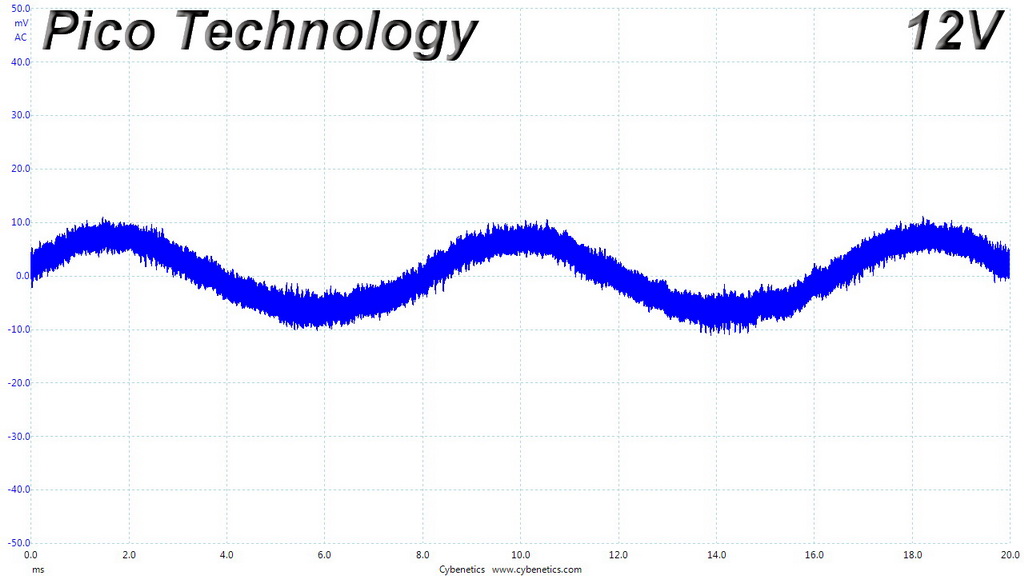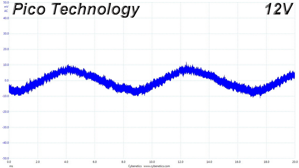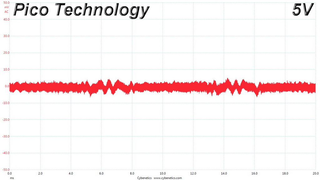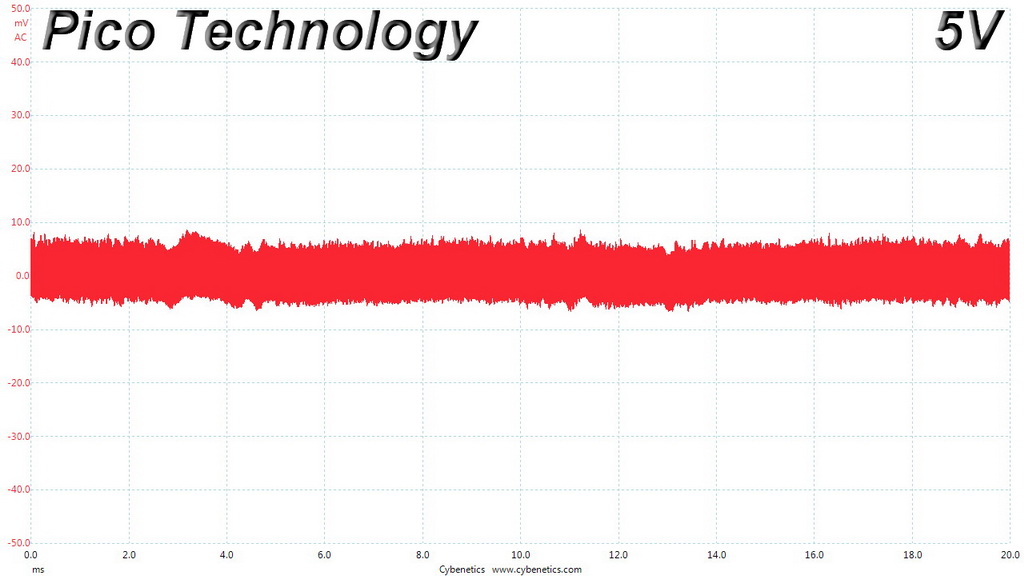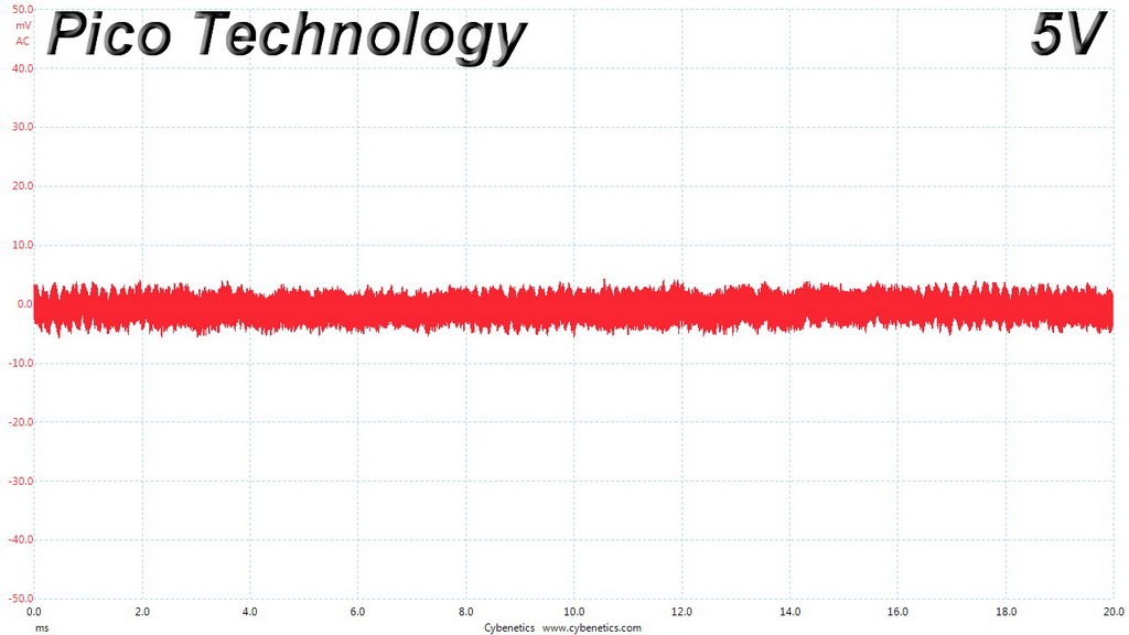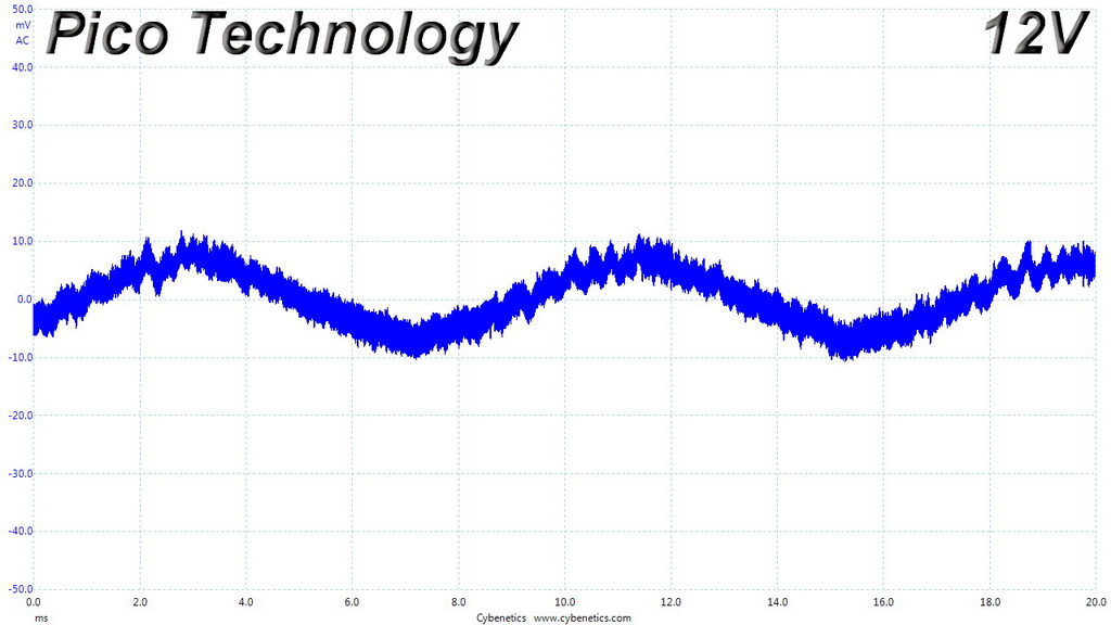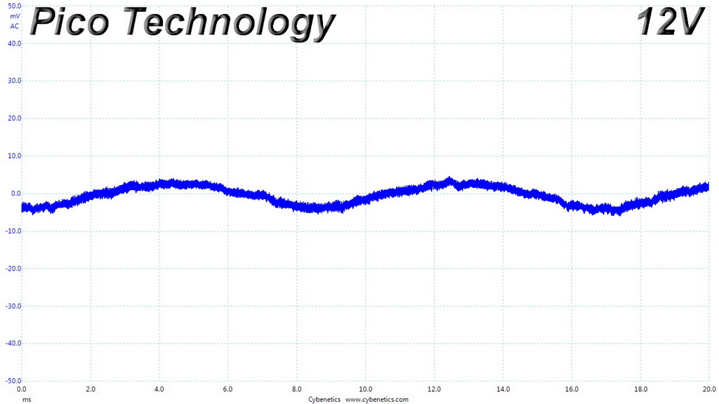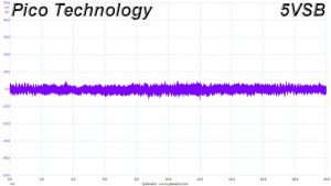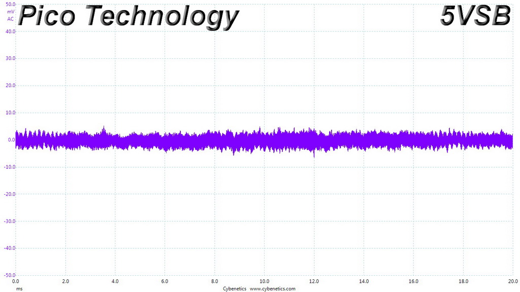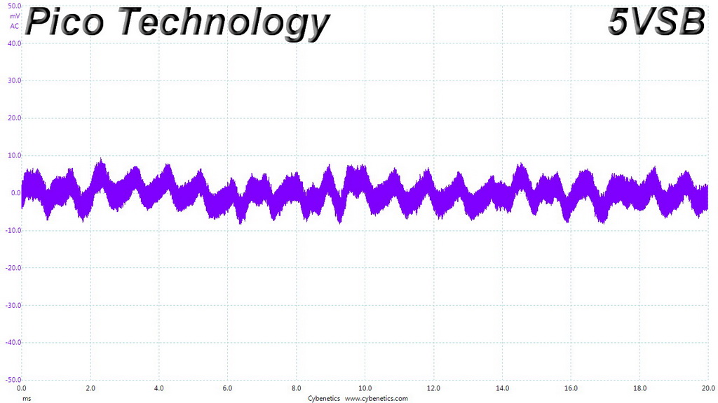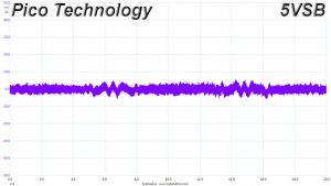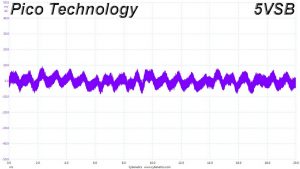 The following oscilloscope screenshots illustrate the AC ripple and noise registered on the main rails (+12V, 5V, 3.3V and 5VSB). The bigger the fluctuations on the screen, the bigger the ripple/noise. We set 0.01 V/Div (each vertical division/box equals 0.01V) as the standard for all measurements.