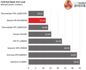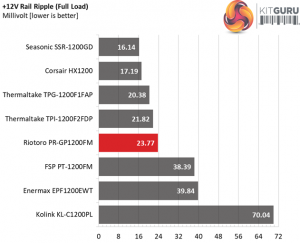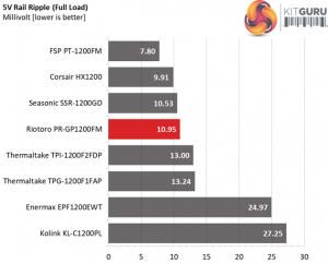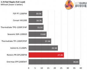 The following table includes the ripple levels we measured on the PR-GP1200FM’s rails. The limits, according to the ATX specification, are 120mV (+12V) and 50mV (5V, 3.3V, and 5VSB).