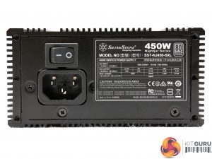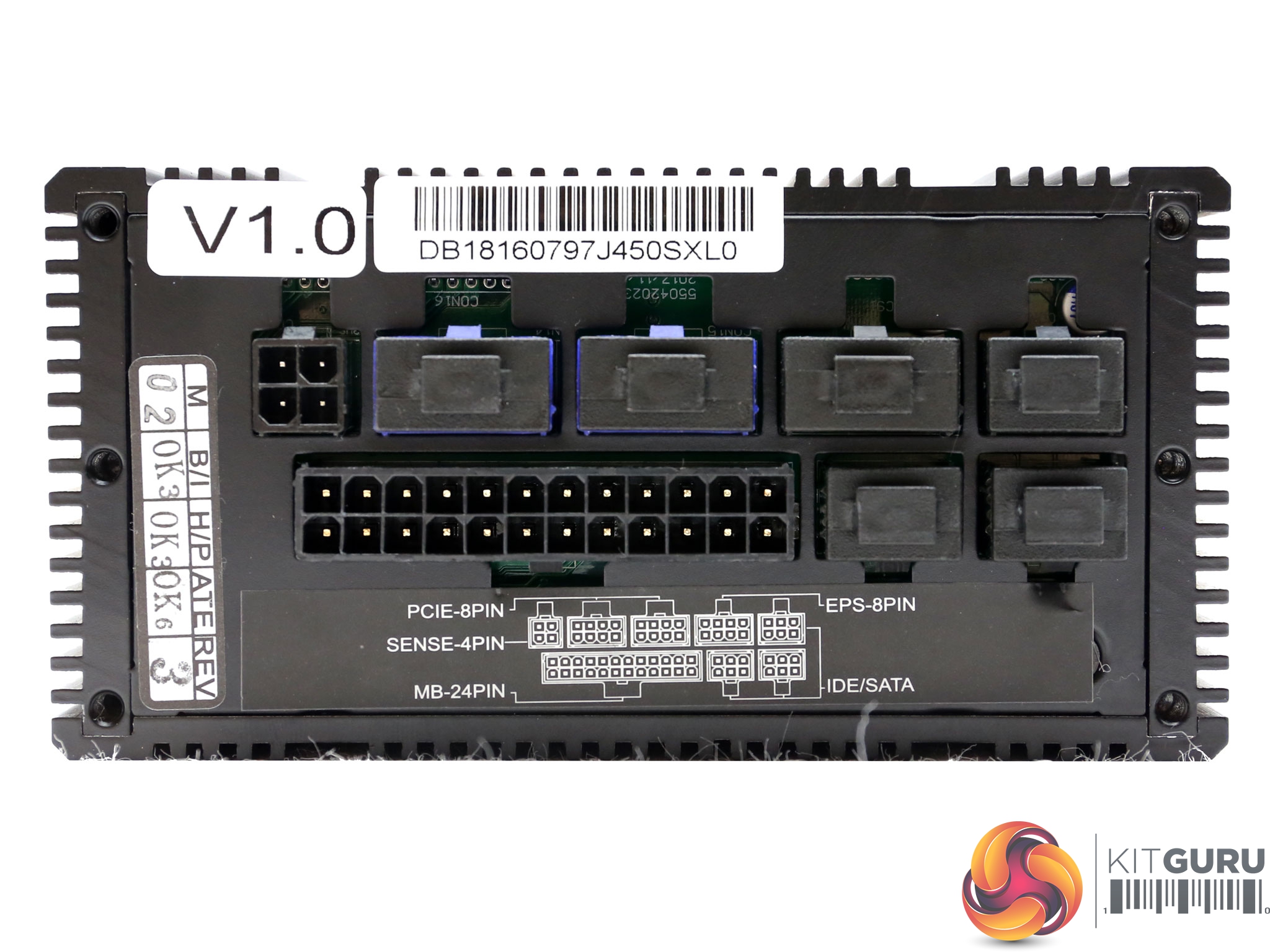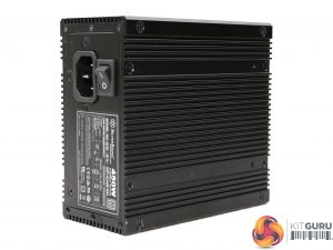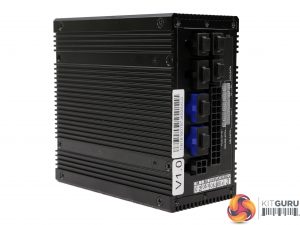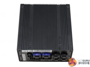 Thankfully there is a power switch while the power specifications label could be only installed at the front, since there is no flat surface available anywhere else on this supply. Finally, on the modular panel we find three stickers, with one of them depicting the PSU's version number, while silicone caps cover the sockets.