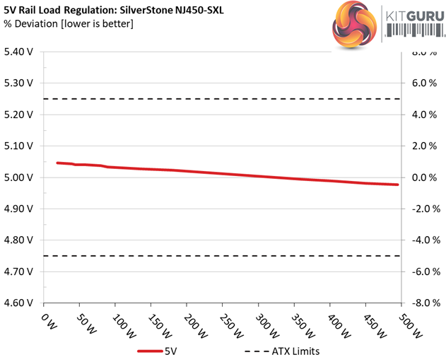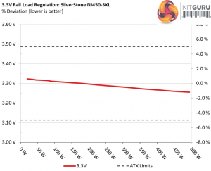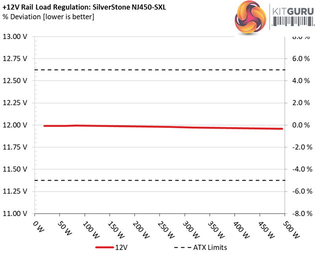 The first set of tests reveals the stability of the voltage rails and the NJ450-SXL’s efficiency. The applied load equals (approximately) 10 to 110 percent of the power supplies maximum load in increments of 10 percentage points.