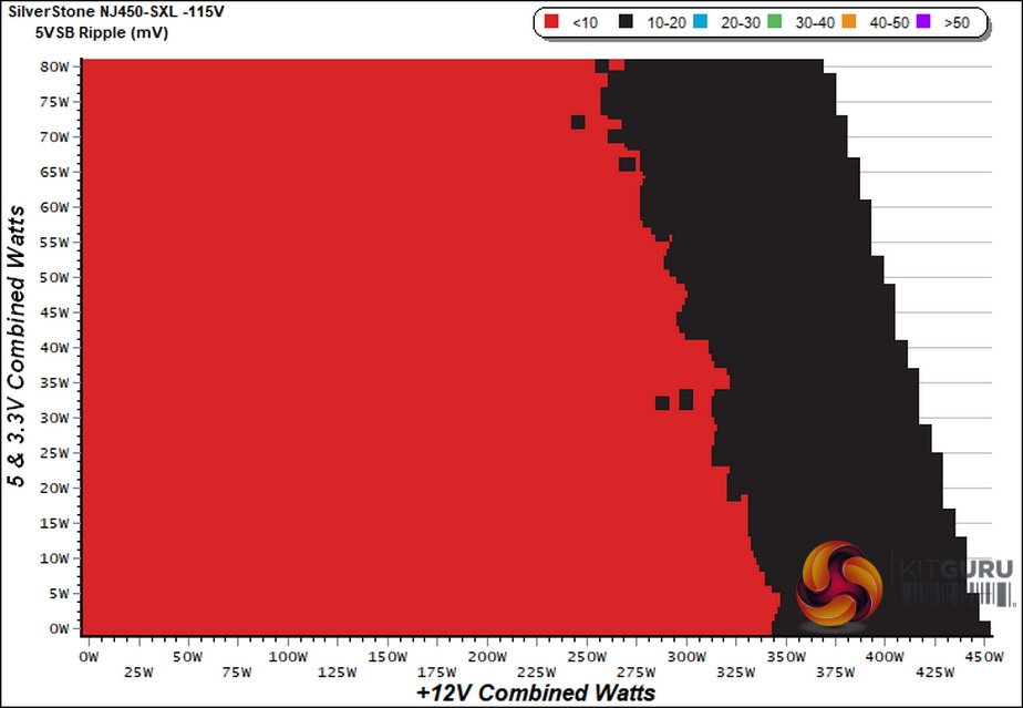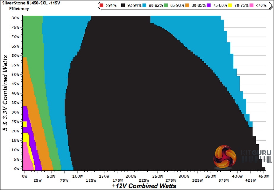 The PSU's efficiency is really high, putting to shame other Platinum and ETA-A PSUs. As you can see in the chart above, in the majority of its operation efficiency is above 92%.