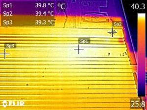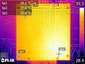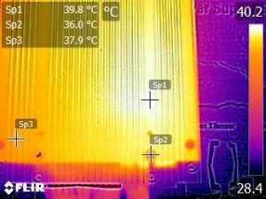 We apply half-load for 10 minutes with the PSU's top cover and cooling fan removed before taking photos with our modified FLIR E4 camera that delivers 320×240 IR resolution (76,800 pixels).
