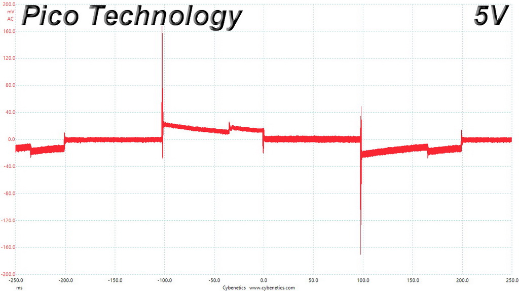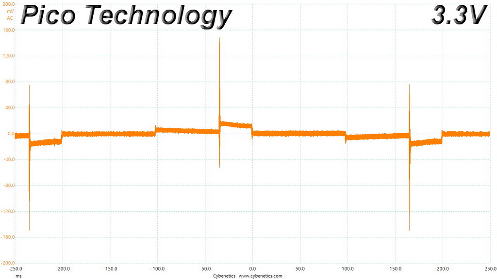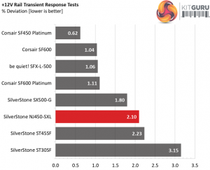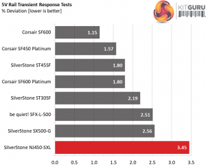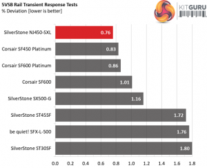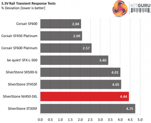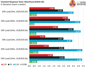 Since almost all caps in the secondary side are polymer ones, their capacity is limited – so it is natural to see mediocre transient response performance. The 3.3V rail registers the worst performance failing in four out of the six tests.