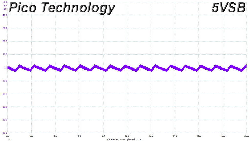 The following oscilloscope screenshots illustrate the AC ripple and noise registered on the main rails (+12V, 5V, 3.3V and 5VSB). The bigger the fluctuations on the screen, the bigger the ripple/noise. We set 0.01 V/Div (each vertical division/box equals 0.01V) as the standard for all measurements.