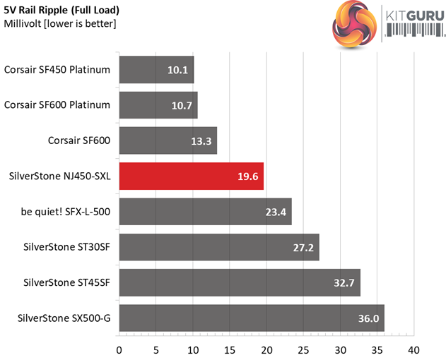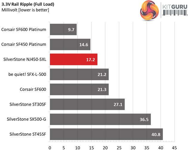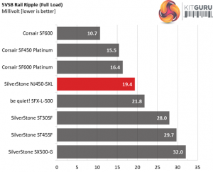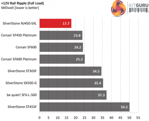 The following table includes the ripple levels we measured on the NJ450-SXL’s rails. The limits, according to the ATX specification, are 120mV (+12V) and 50mV (5V, 3.3V, and 5VSB).